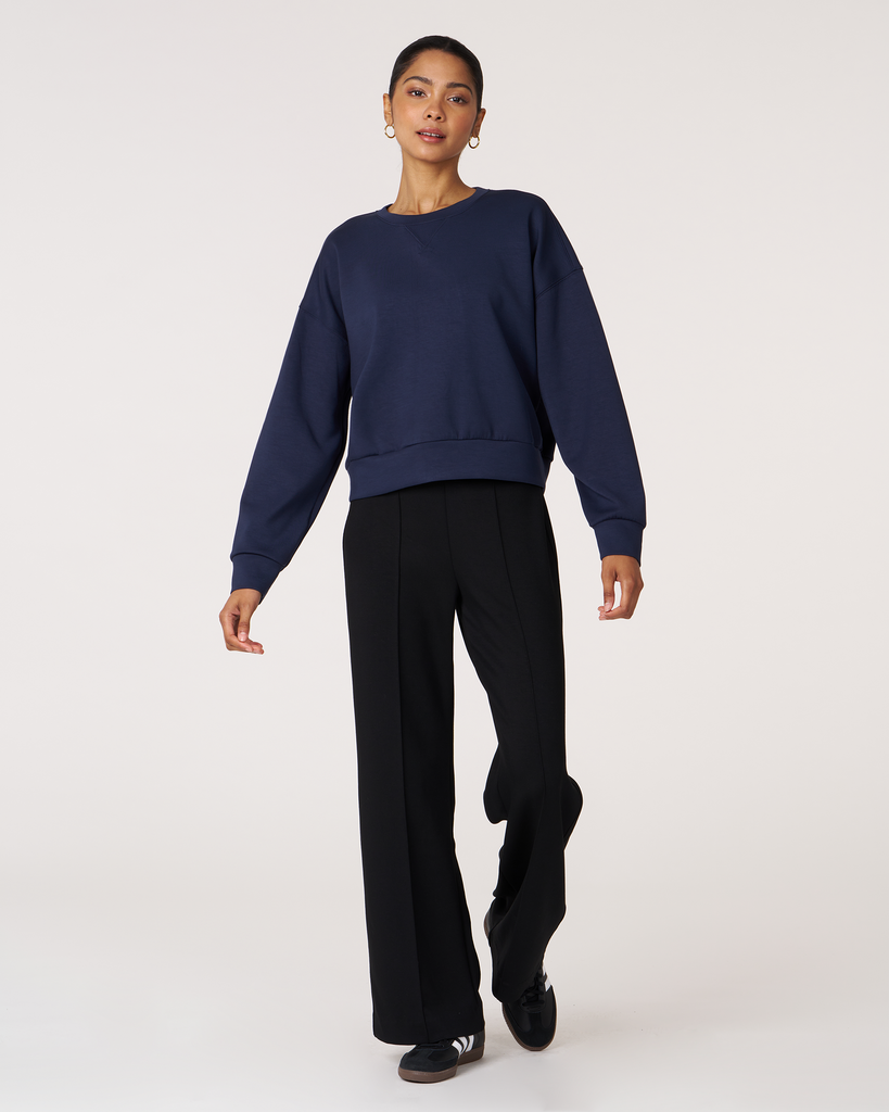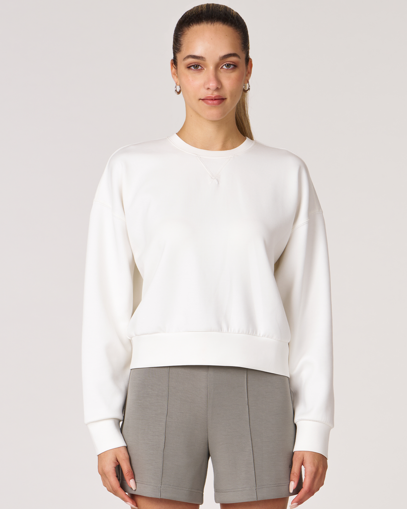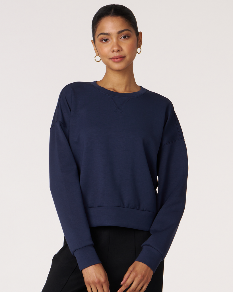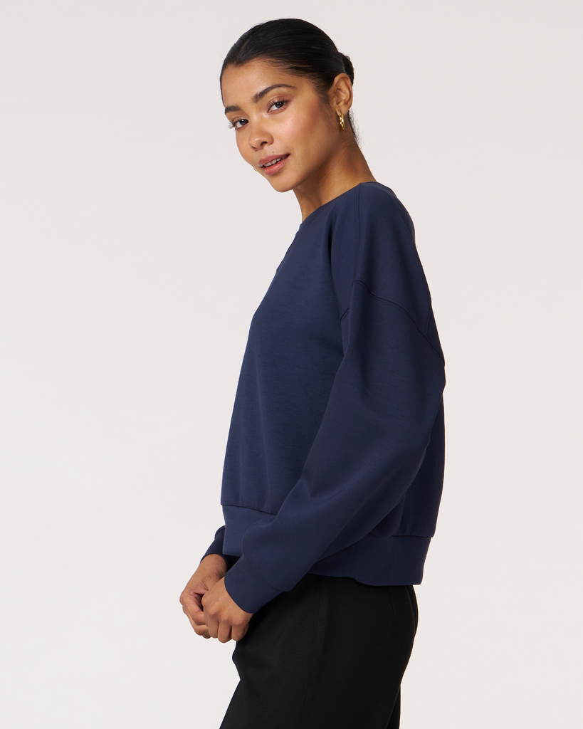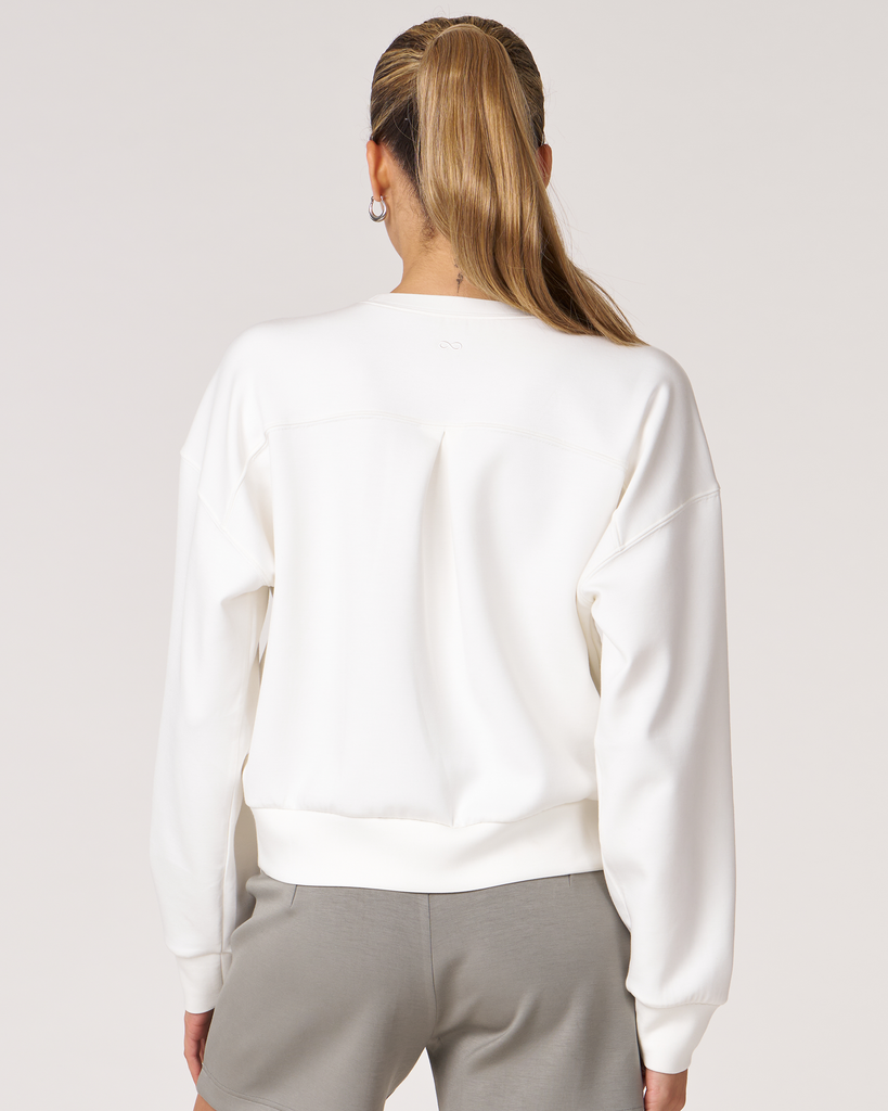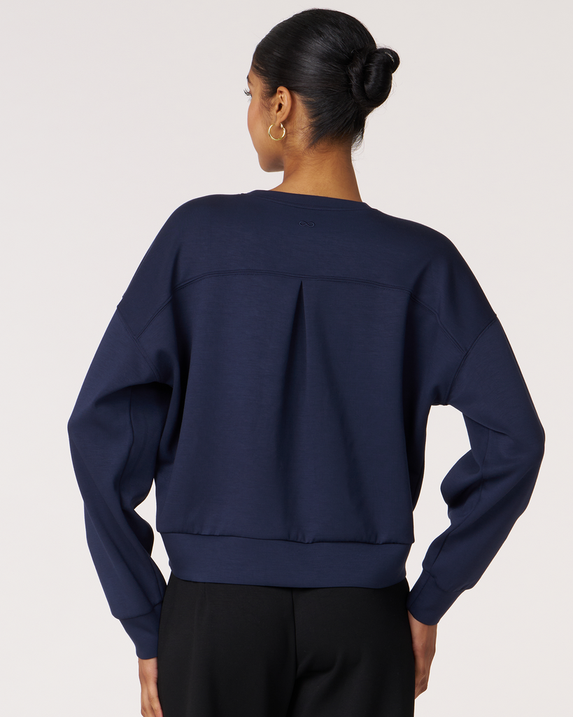 The scuba crewneck sweatshirt is designed with a relaxed fit and dropped shoulders, perfect for any casual activity. It is ideal for dressing down or layering up, whether paired with shorts or joggers. Features subtle embroidered logo and pleat on the back for an elevated piece. Layer this sweatshirt over a blouse and pair it with our pintuck wide leg pant for a professional look. Made from our luxurious scuba fabric, it is has a medium-weight coverage and a drapey feel that is cooling and smooth to touch.