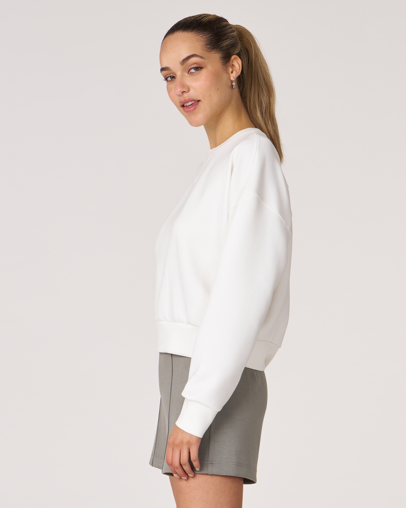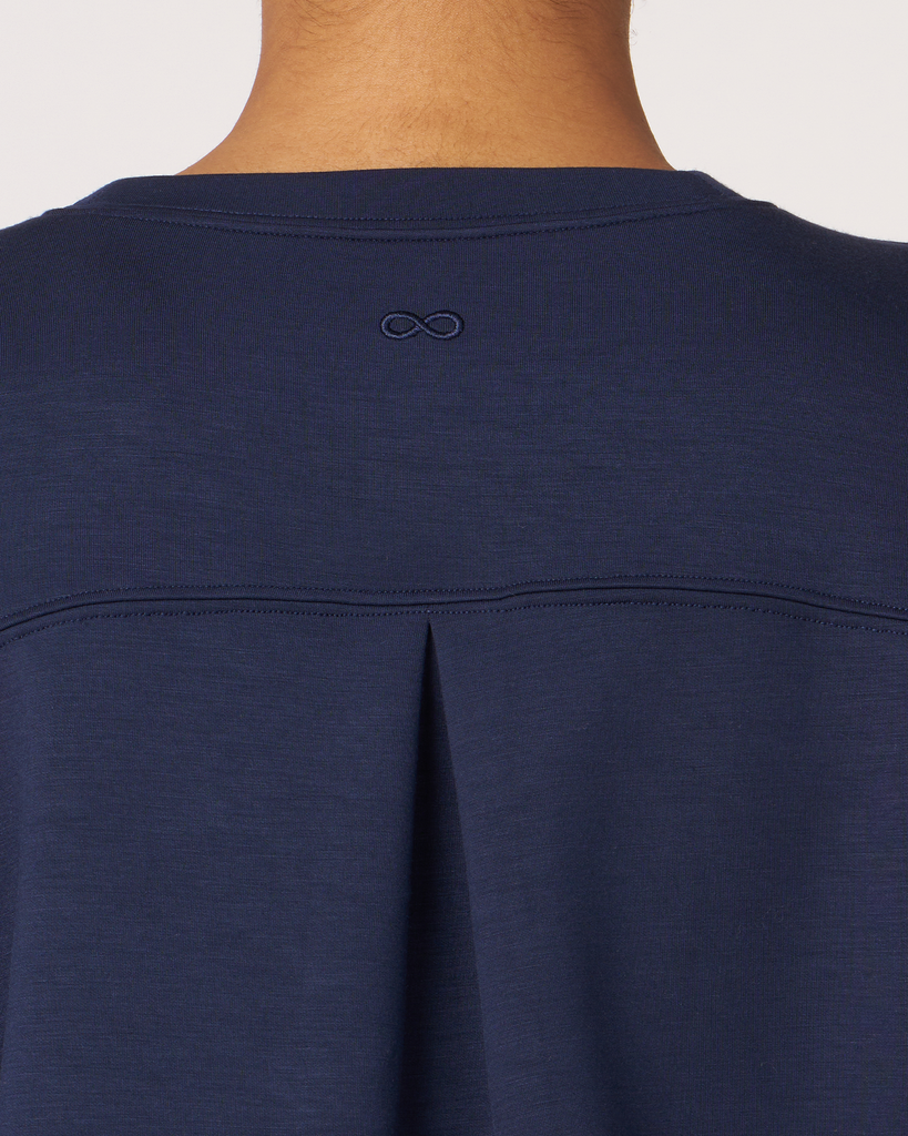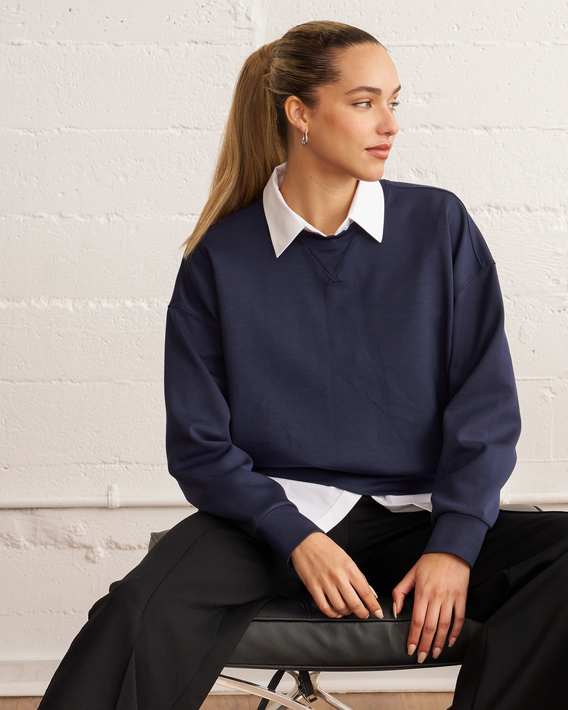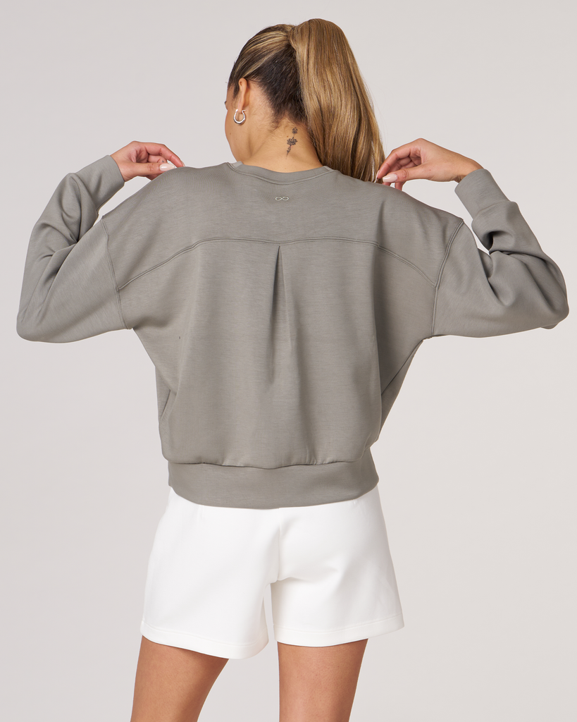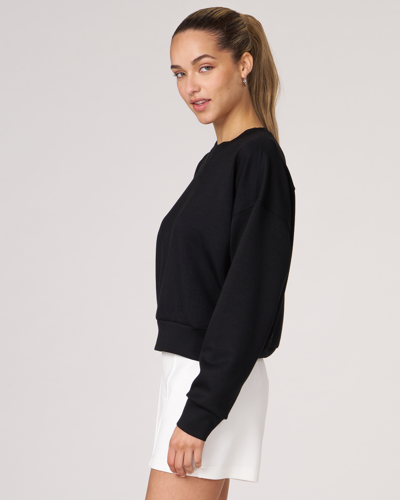 The scuba crewneck sweatshirt is designed with a relaxed fit and dropped shoulders, perfect for any casual activity. It is ideal for dressing down or layering up, whether paired with shorts or joggers. Features subtle embroidered logo and pleat on the back for an elevated piece. Layer this sweatshirt over a blouse and pair it with our pintuck wide leg pant for a professional look. Made from our luxurious scuba fabric, it is has a medium-weight coverage and a drapey feel that is cooling and smooth to touch.