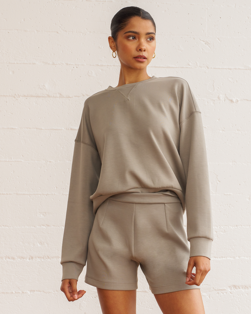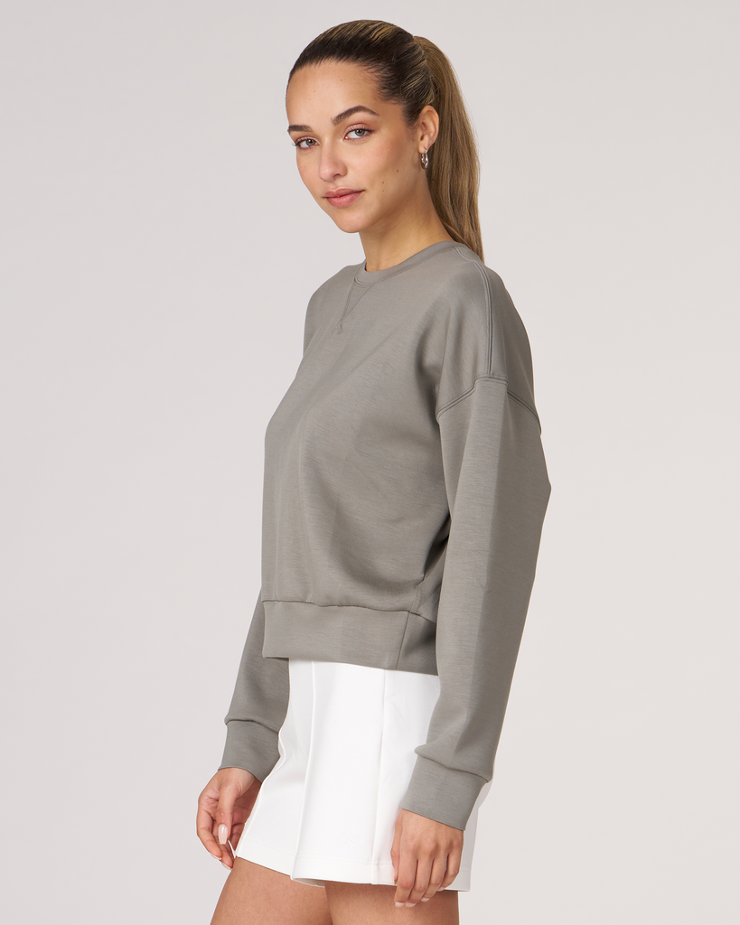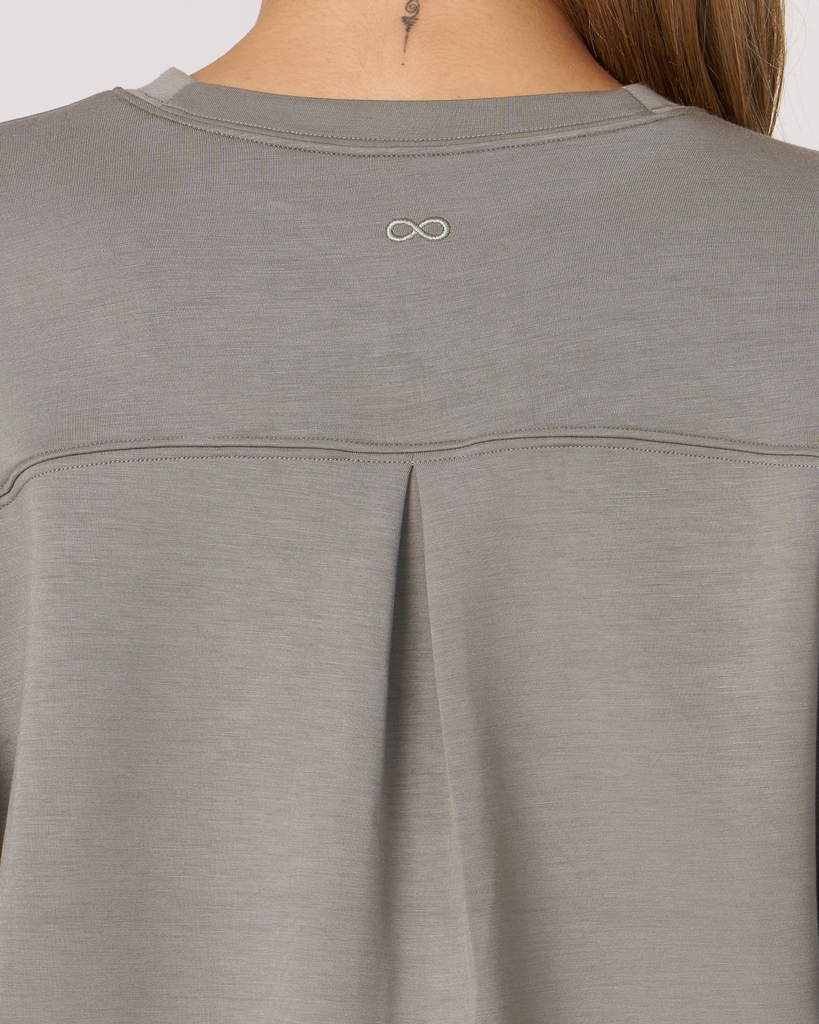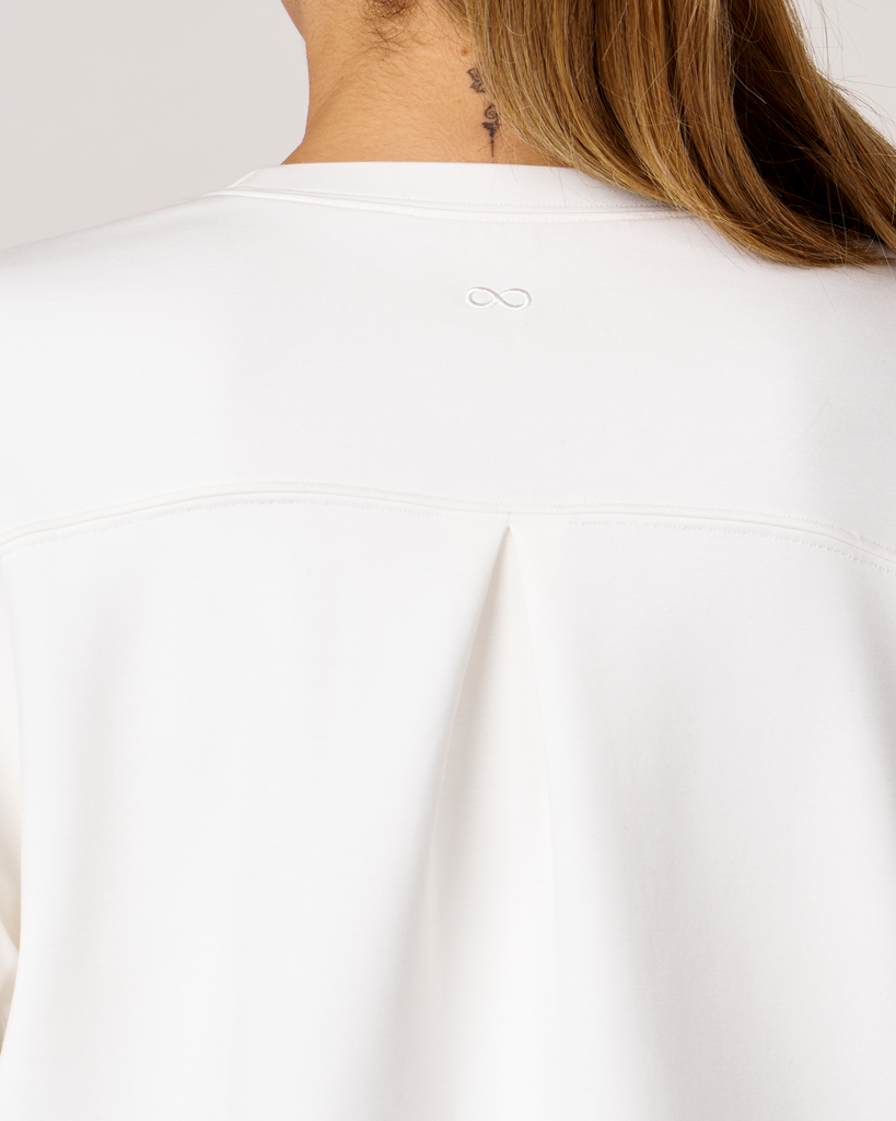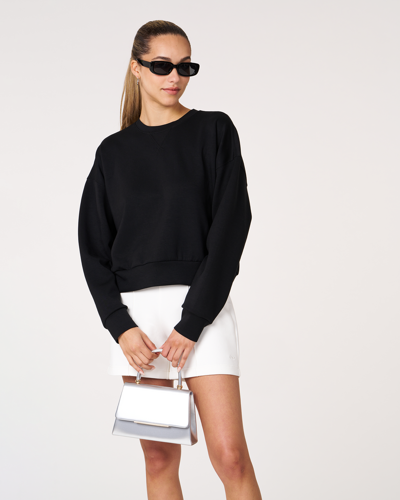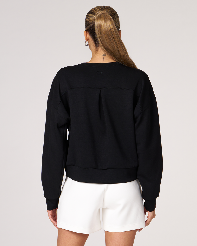 The scuba crewneck sweatshirt is designed with a relaxed fit and dropped shoulders, perfect for any casual activity. It is ideal for dressing down or layering up, whether paired with shorts or joggers. Features subtle embroidered logo and pleat on the back for an elevated piece. Layer this sweatshirt over a blouse and pair it with our pintuck wide leg pant for a professional look. Made from our luxurious scuba fabric, it is has a medium-weight coverage and a drapey feel that is cooling and smooth to touch.
