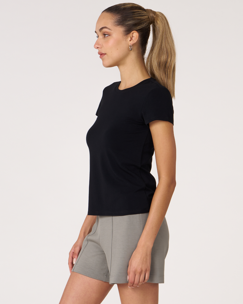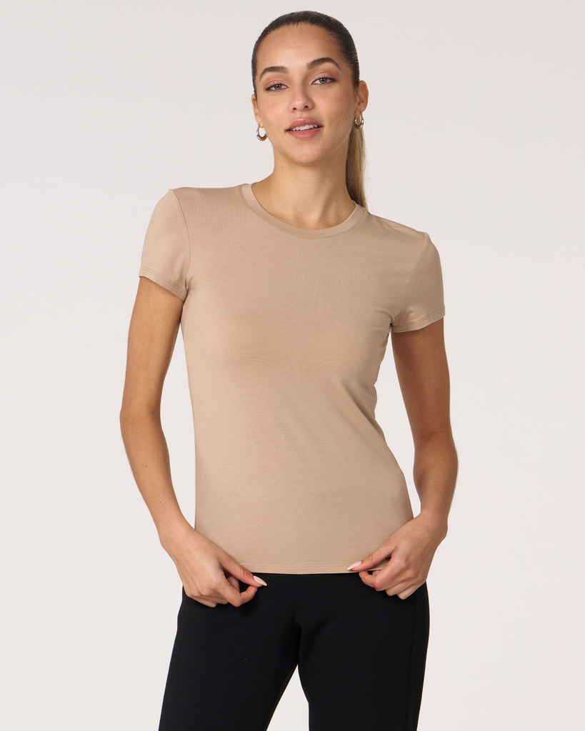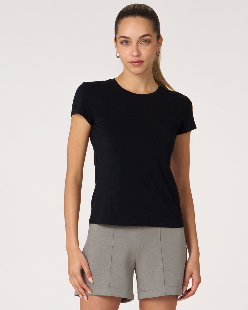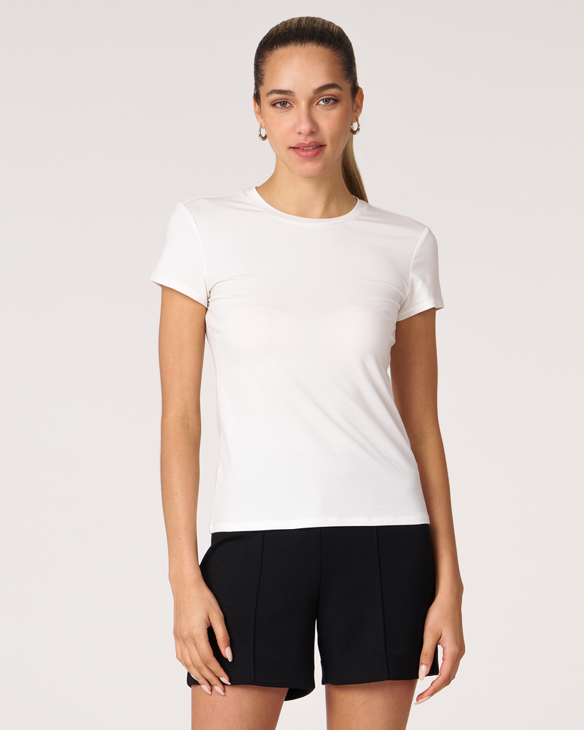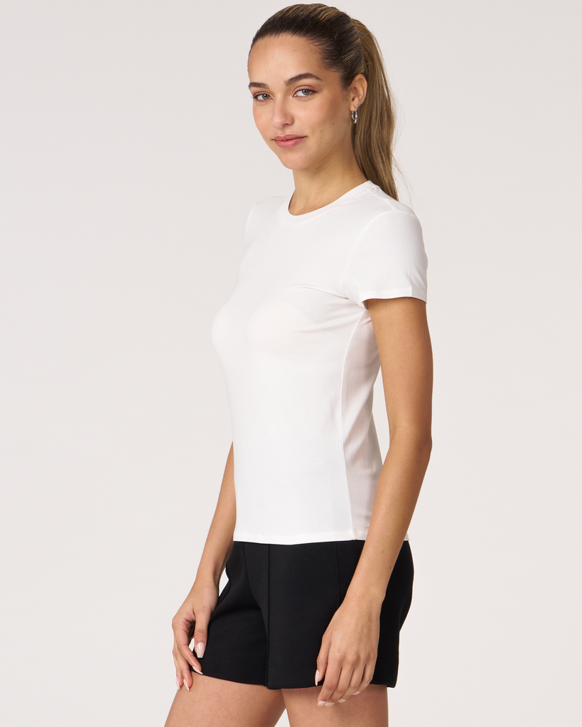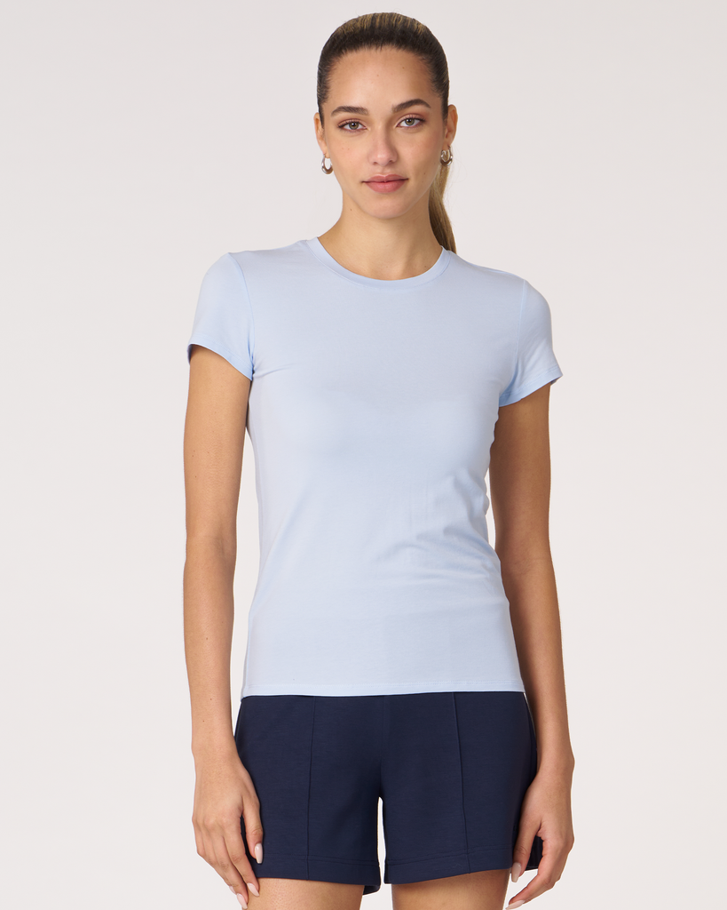 Meet your new go-to crewneck tee that is slim-fitted and can be worn as is or tucked in. A wardrobe staple that is made in soft pima cotton, cool to touch modal, and a hint of stretch for ultimate comfort and style. Biocompact finish keeps the fabric long lasting and smooth.