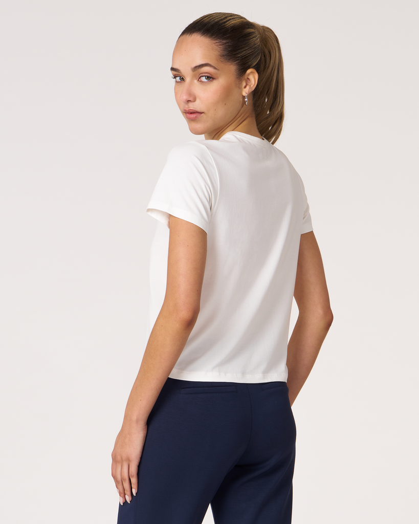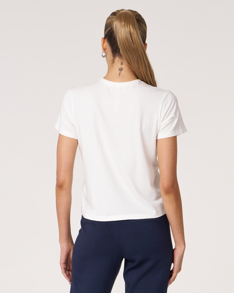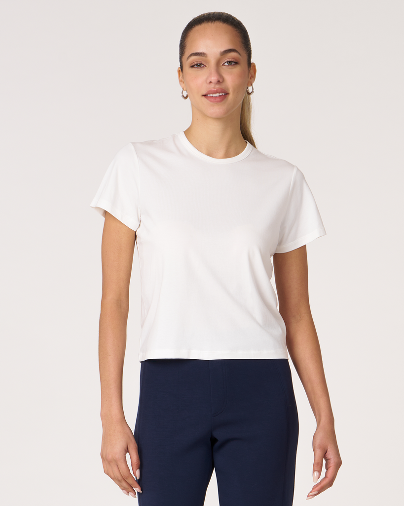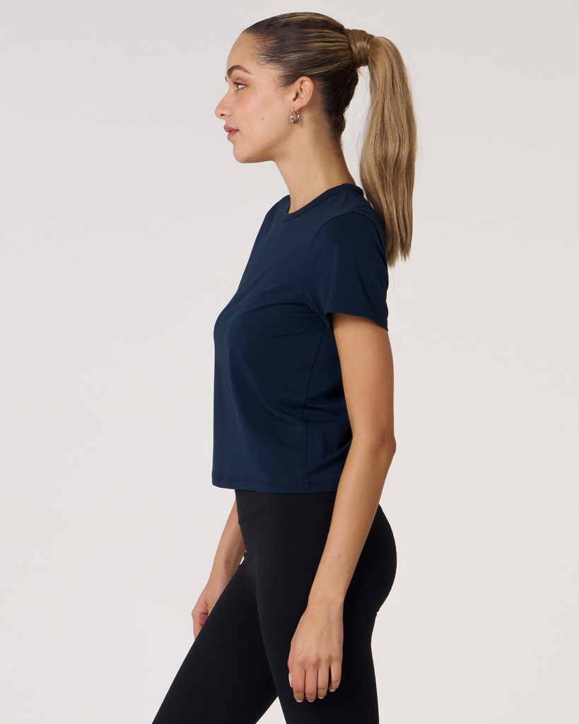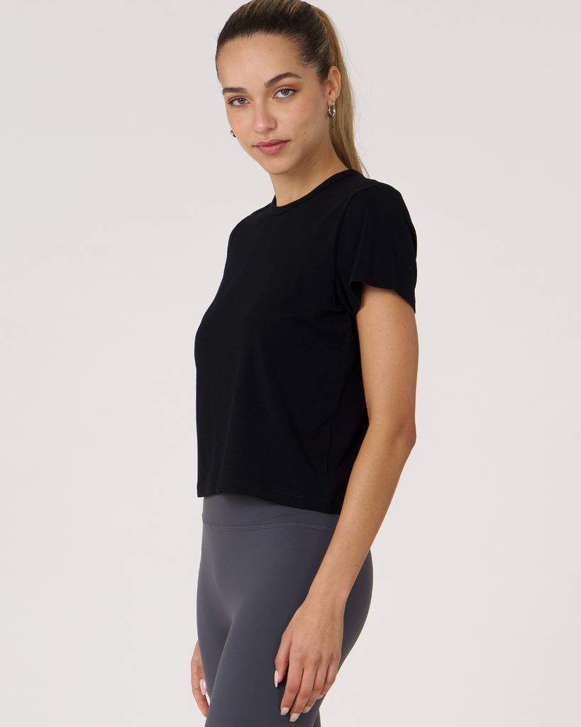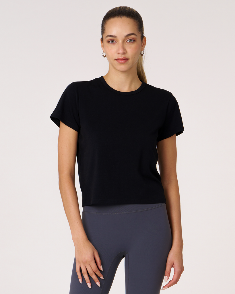 Meet your new go-to crop tee that effortlessly pairs perfectly with leggings. A wardrobe staple that is made in soft pima cotton, cool to touch modal, and a hint of stretch for ultimate comfort and style. Biocompact finish keeps the fabric long lasting and smooth.