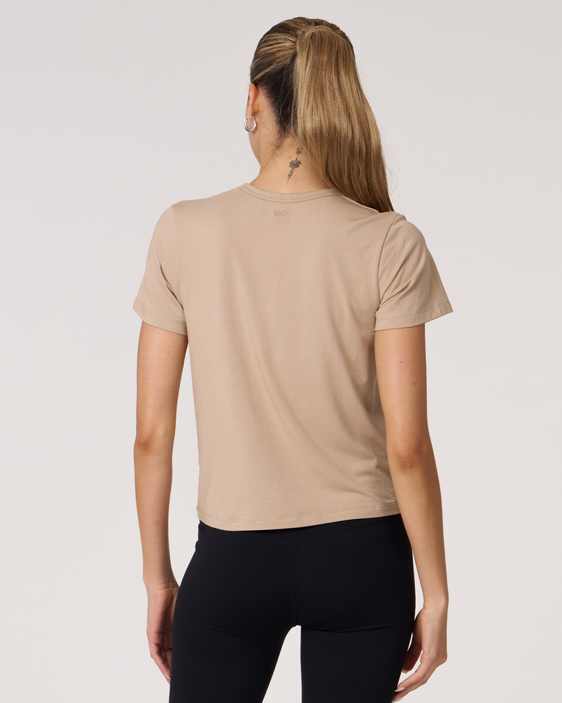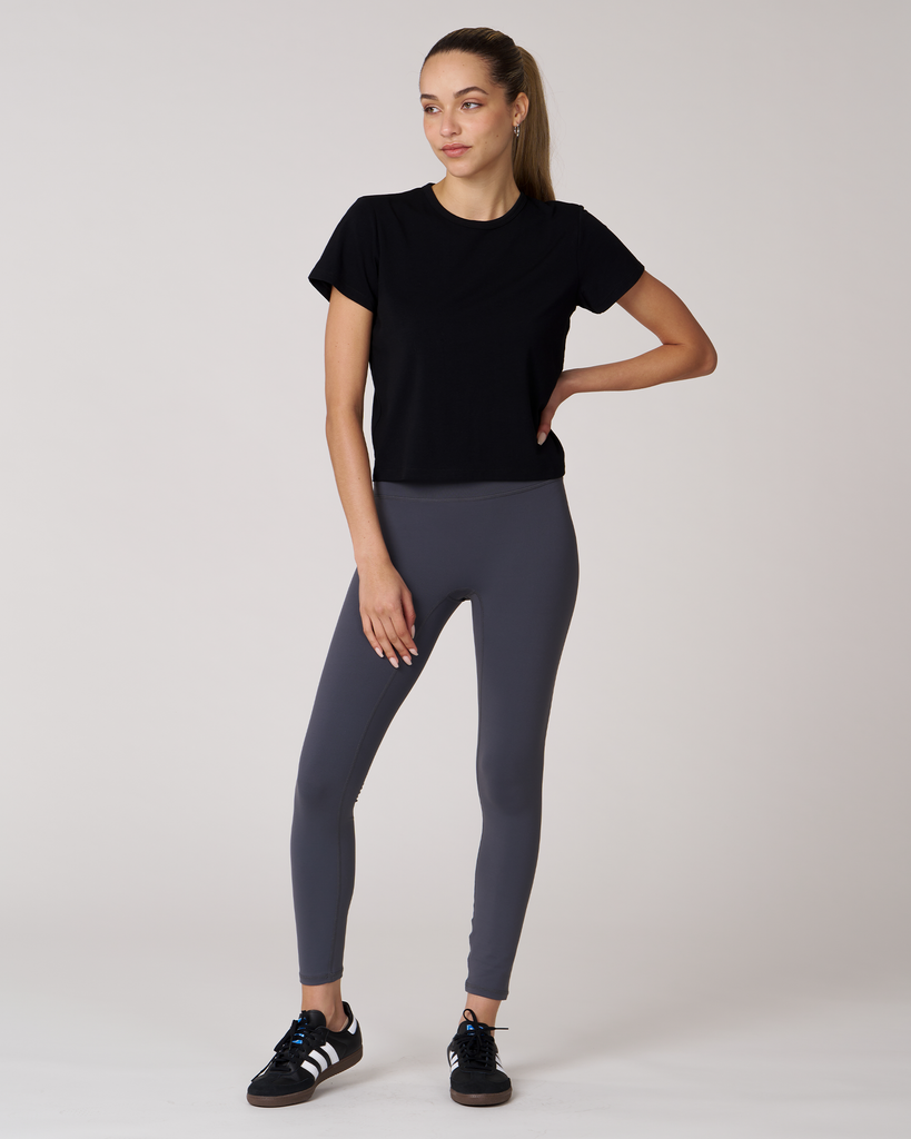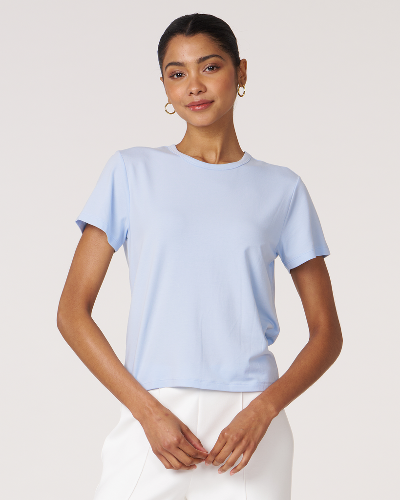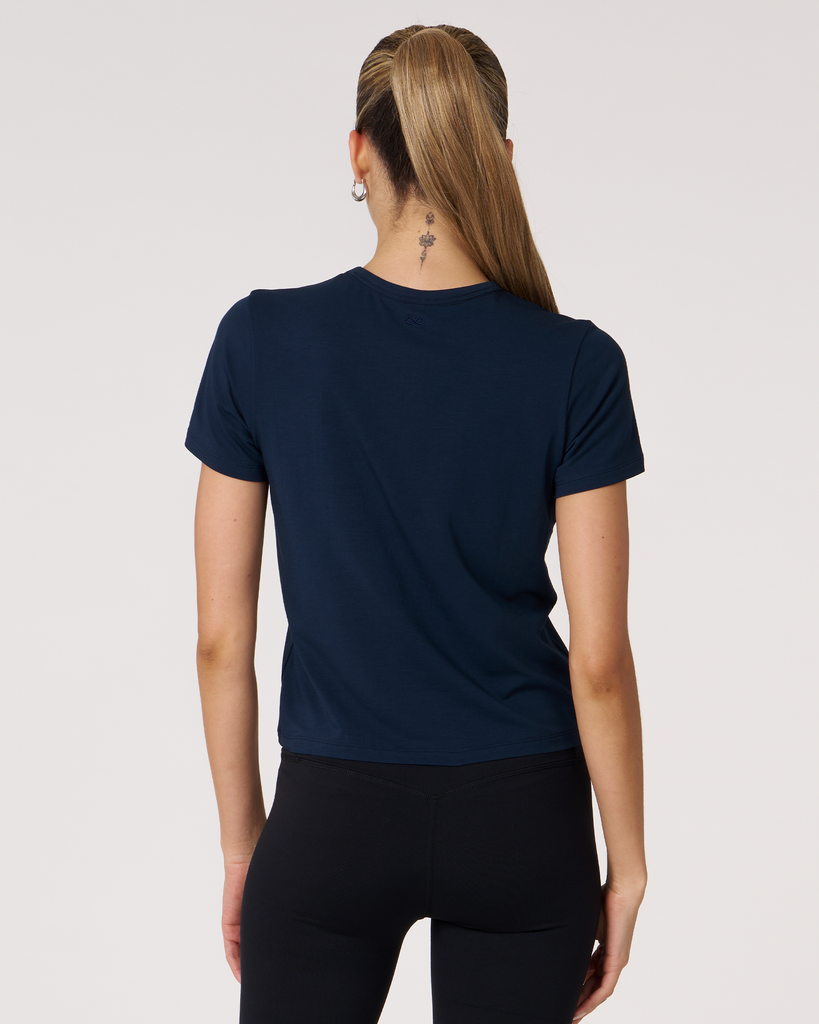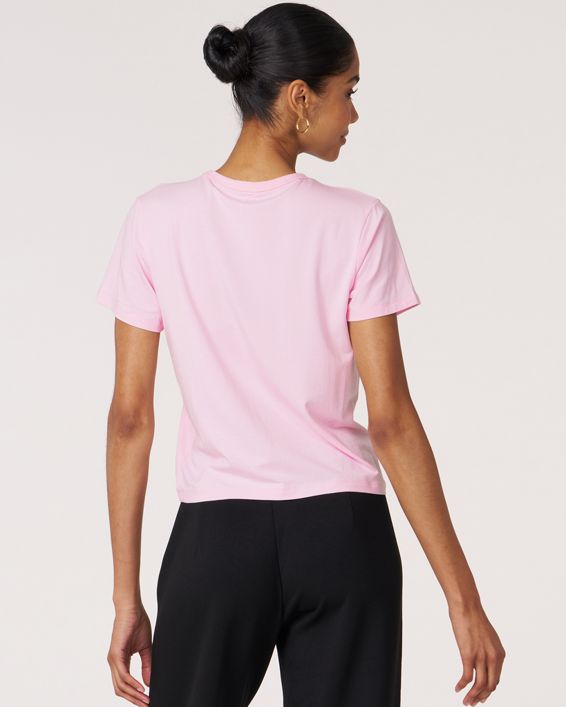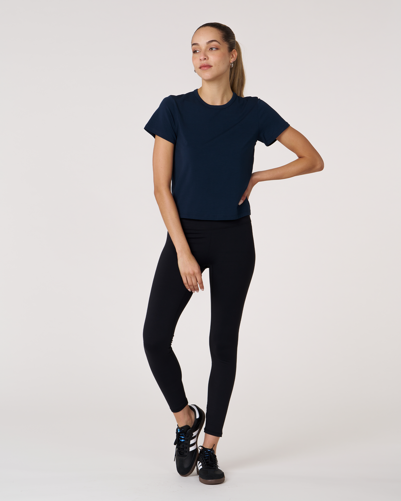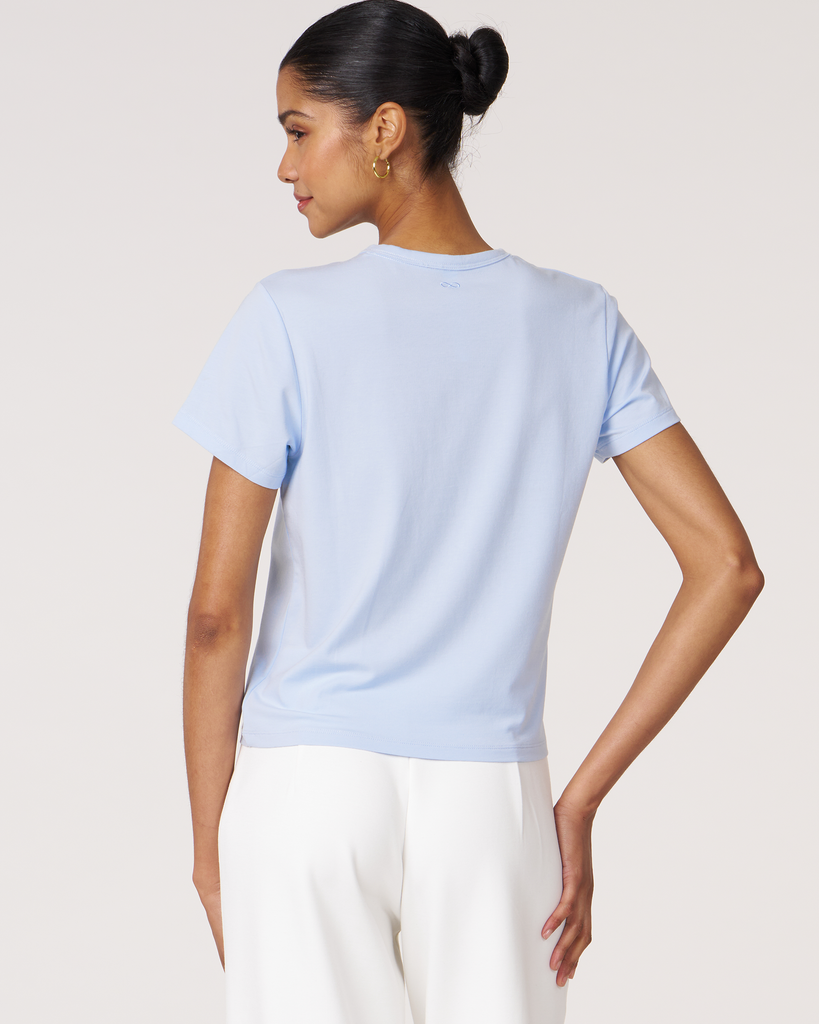 Meet your new go-to crop tee that effortlessly pairs perfectly with leggings. A wardrobe staple that is made in soft pima cotton, cool to touch modal, and a hint of stretch for ultimate comfort and style. Biocompact finish keeps the fabric long lasting and smooth.