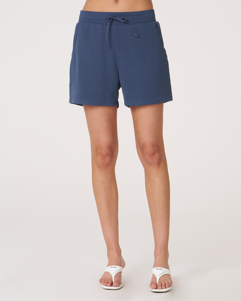 Made with a relaxed fit and designed to maintain its shape, these shorts provide the perfect balance of comfort and style. Features pockets and an encased elastic waist with drawstring to adjust the fit. Ideal to wear for travel, errands, or weekend lounging. The waffle-knit exterior has a cotton-like feel for comfort and sweat-wicking interior to keep you cool and dry. Lightweight and drapey, it's made from a luxurious blend of 49% Modal, 45% polyester, 6% Spandex.