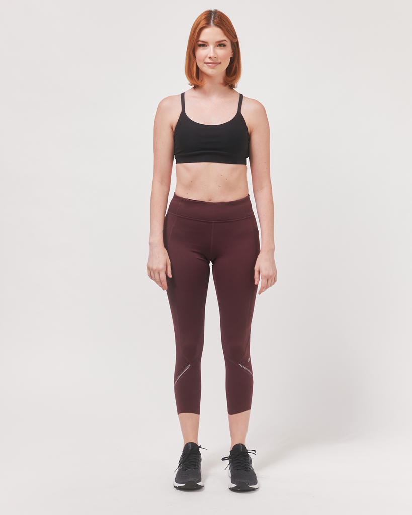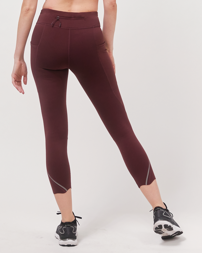 Stay visible at night in our chevron reflective print wrapped around from front to back. Laser cut leg hems allow more room during your high impact activites. Features pockets for storage. For hiking, training, and on the go. Made in Ventiflo™ highest compression yet ultra breathable high 4-way stretch fabric. Squat proof and quick dry. 23" inseam length