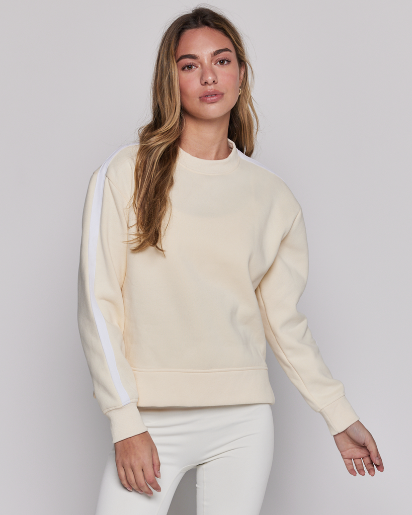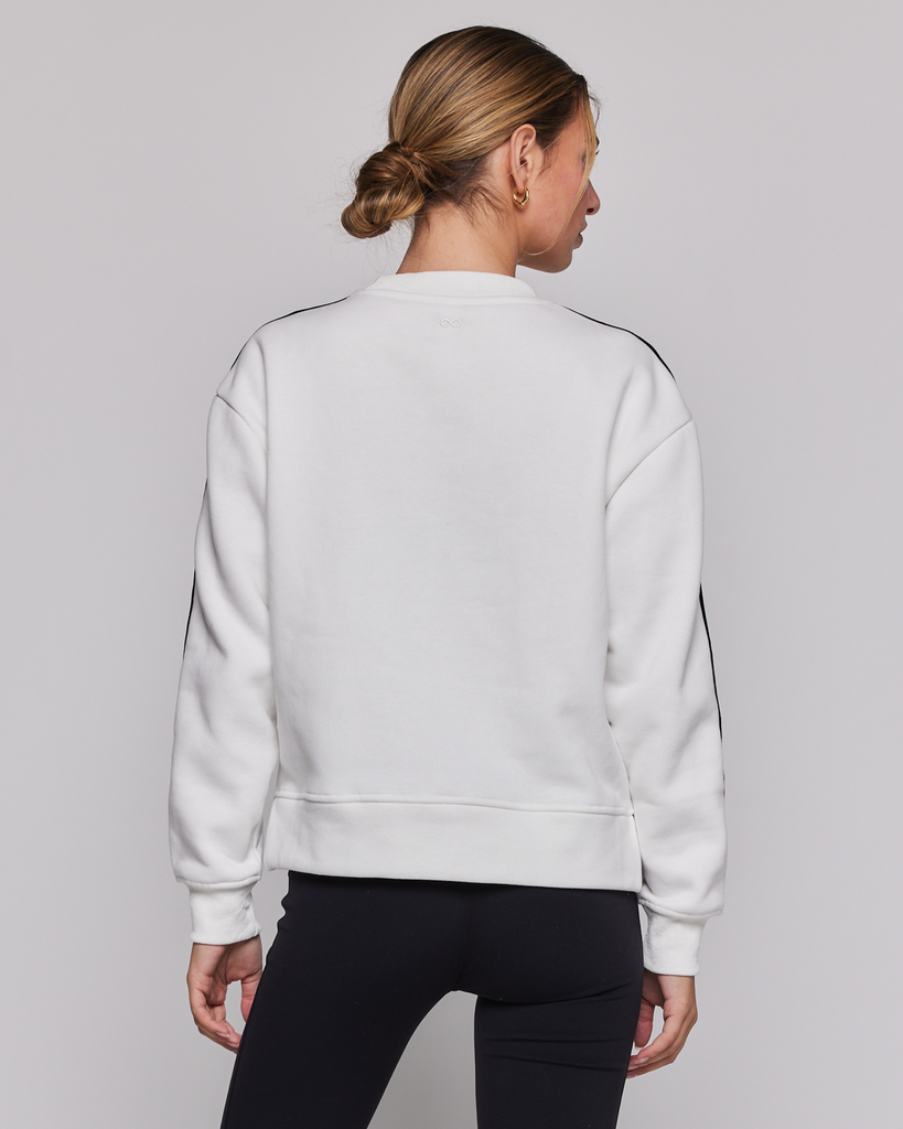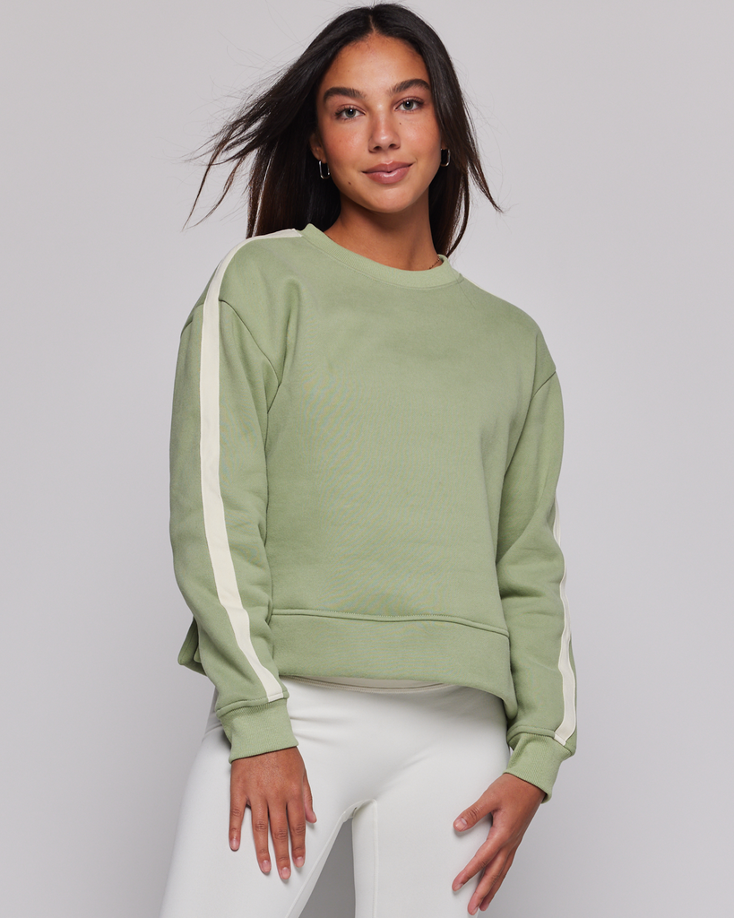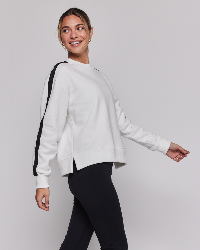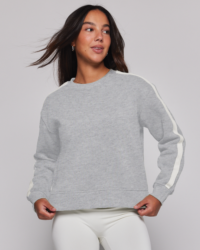 Plush fleeced crewneck sweater featuring stripes for a sporty and everyday look. Wear as an outer layer to and from practice, pair with your favorite leggings or jeans, and wear with sweats for comfy lounging.