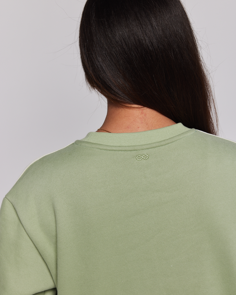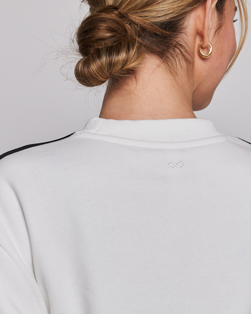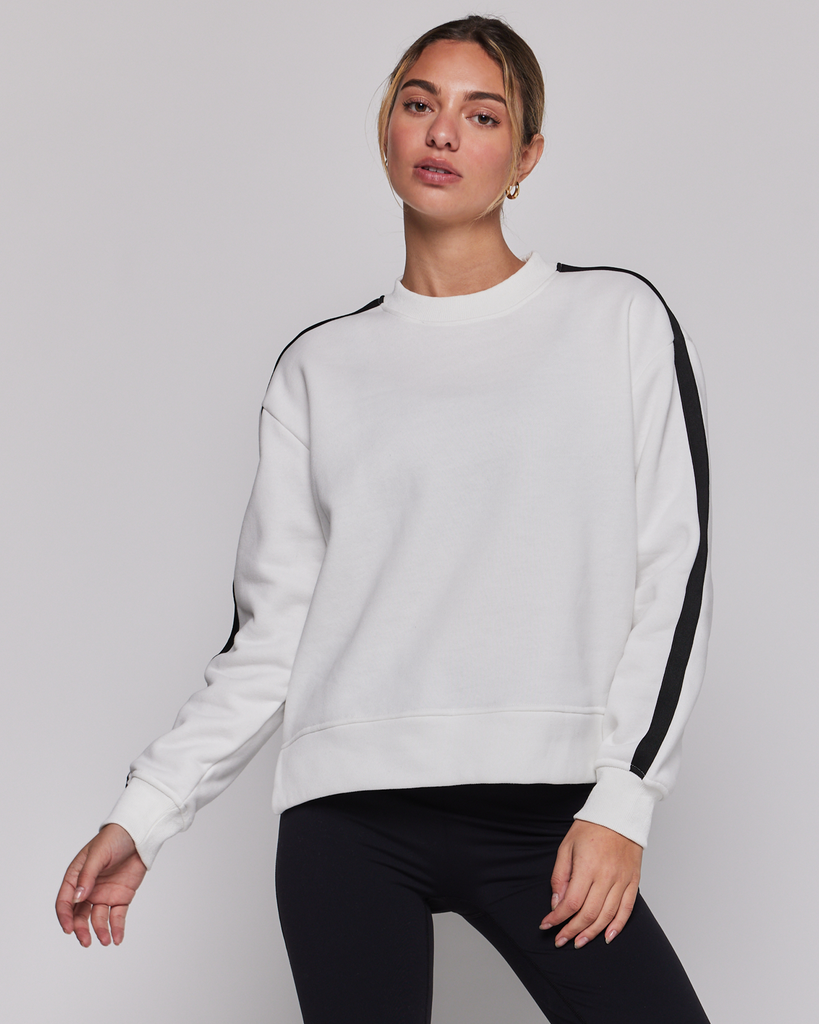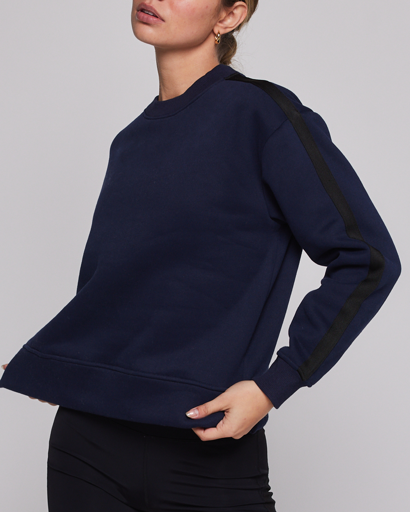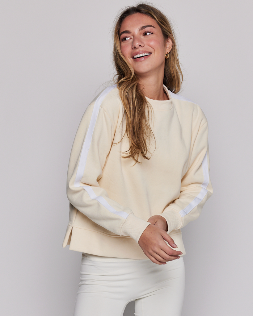Plush fleeced crewneck sweater featuring stripes for a sporty and everyday look. Wear as an outer layer to and from practice, pair with your favorite leggings or jeans, and wear with sweats for comfy lounging.