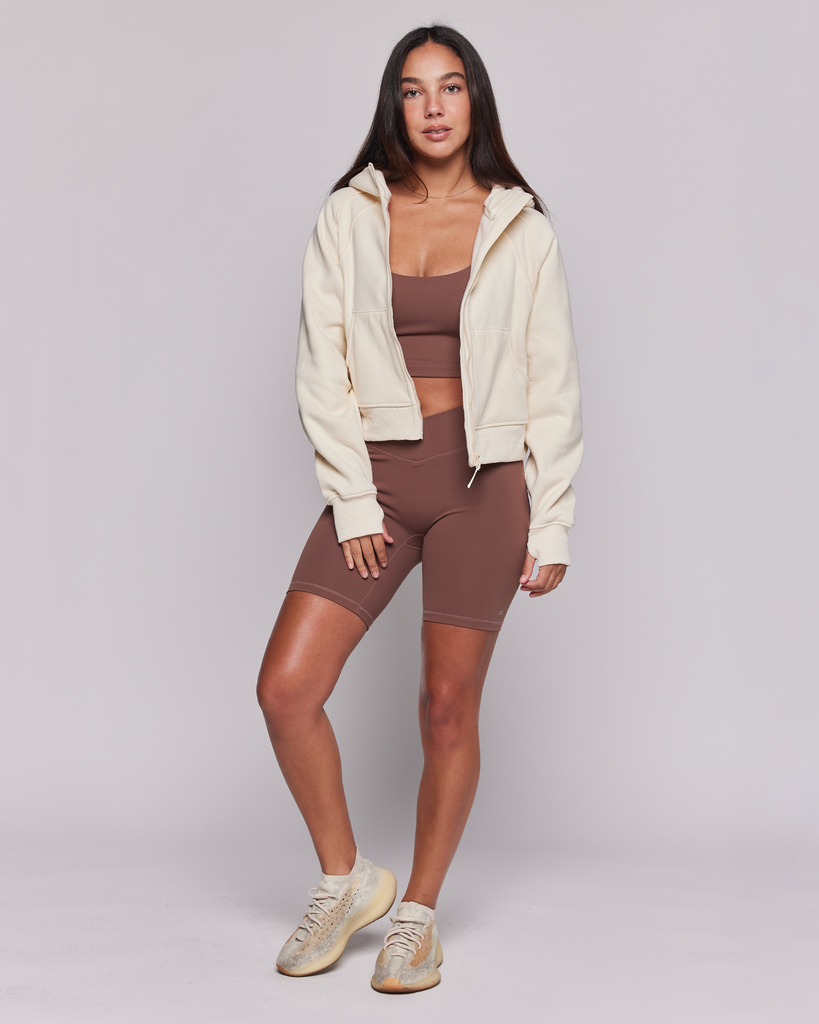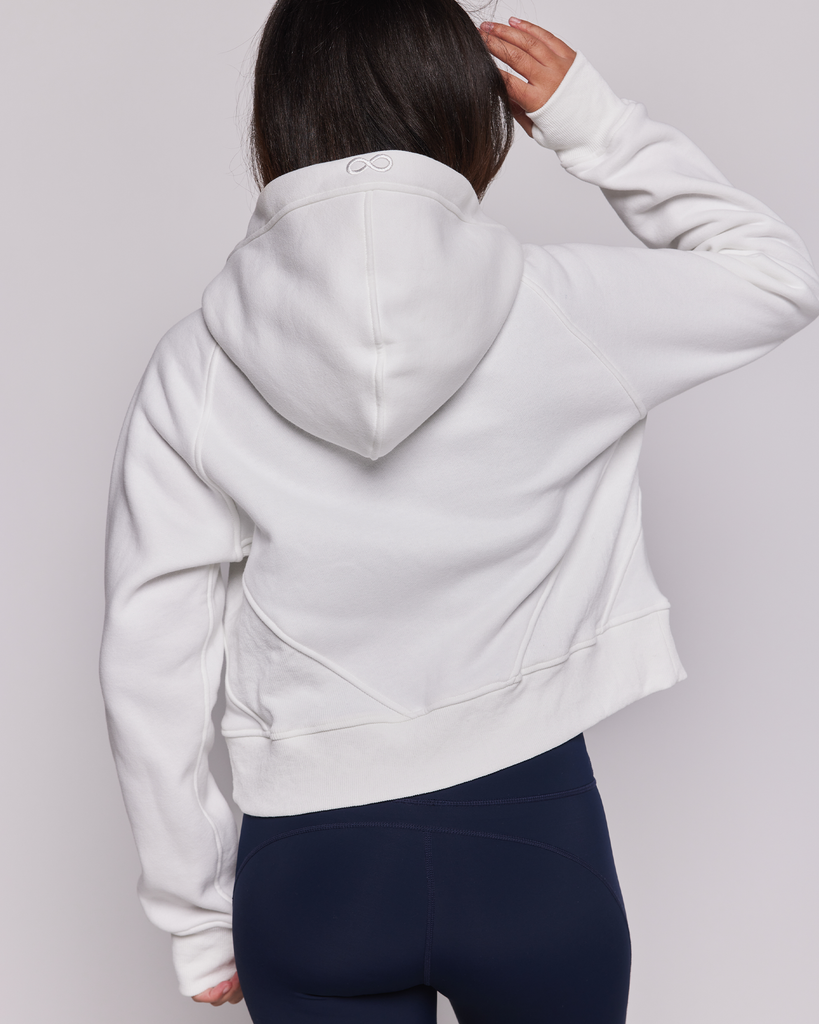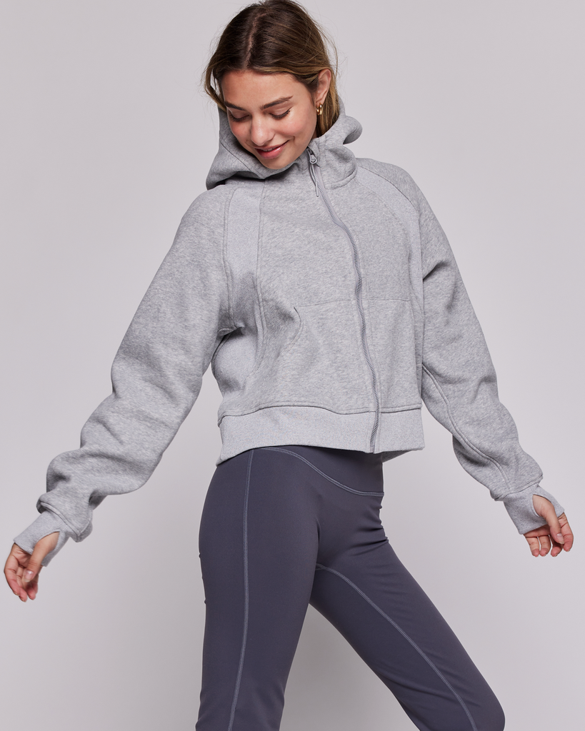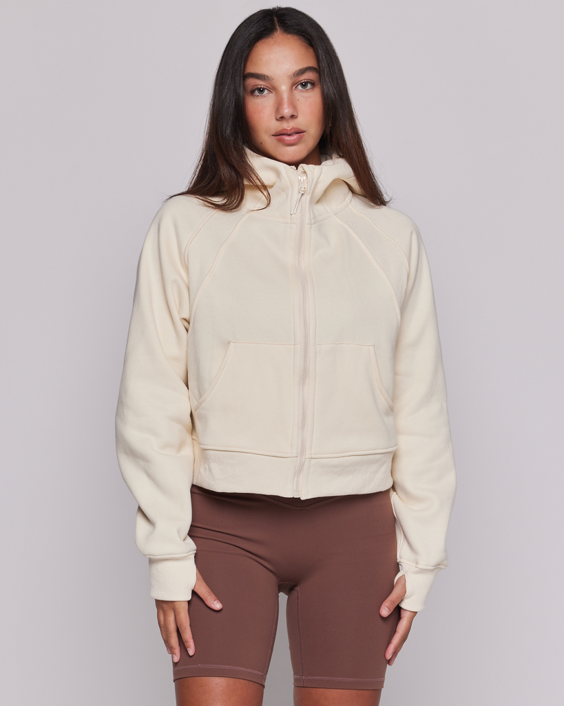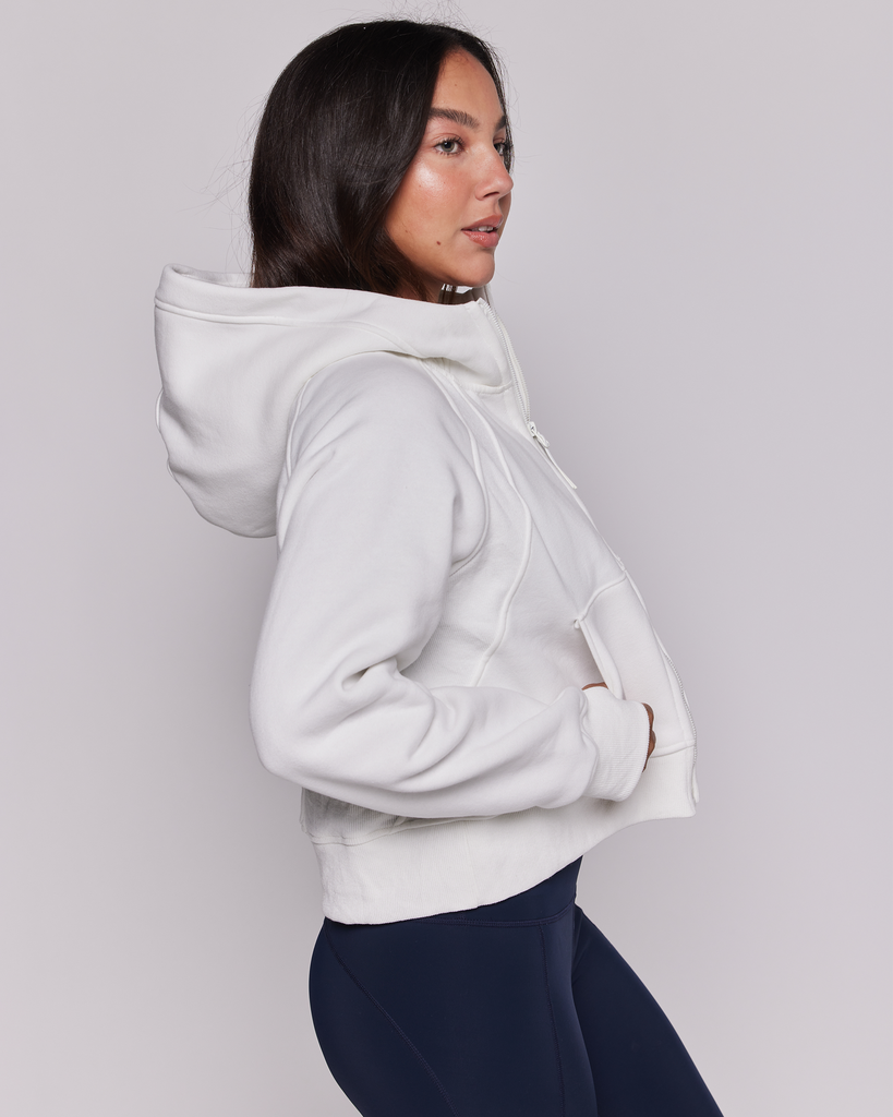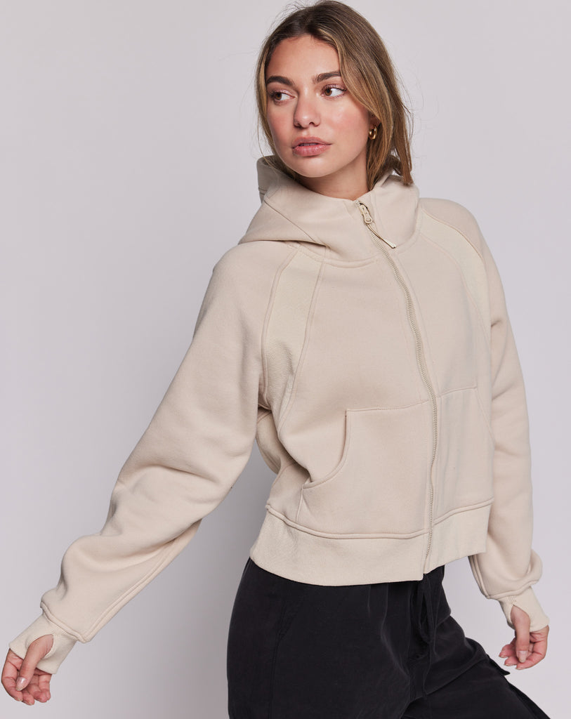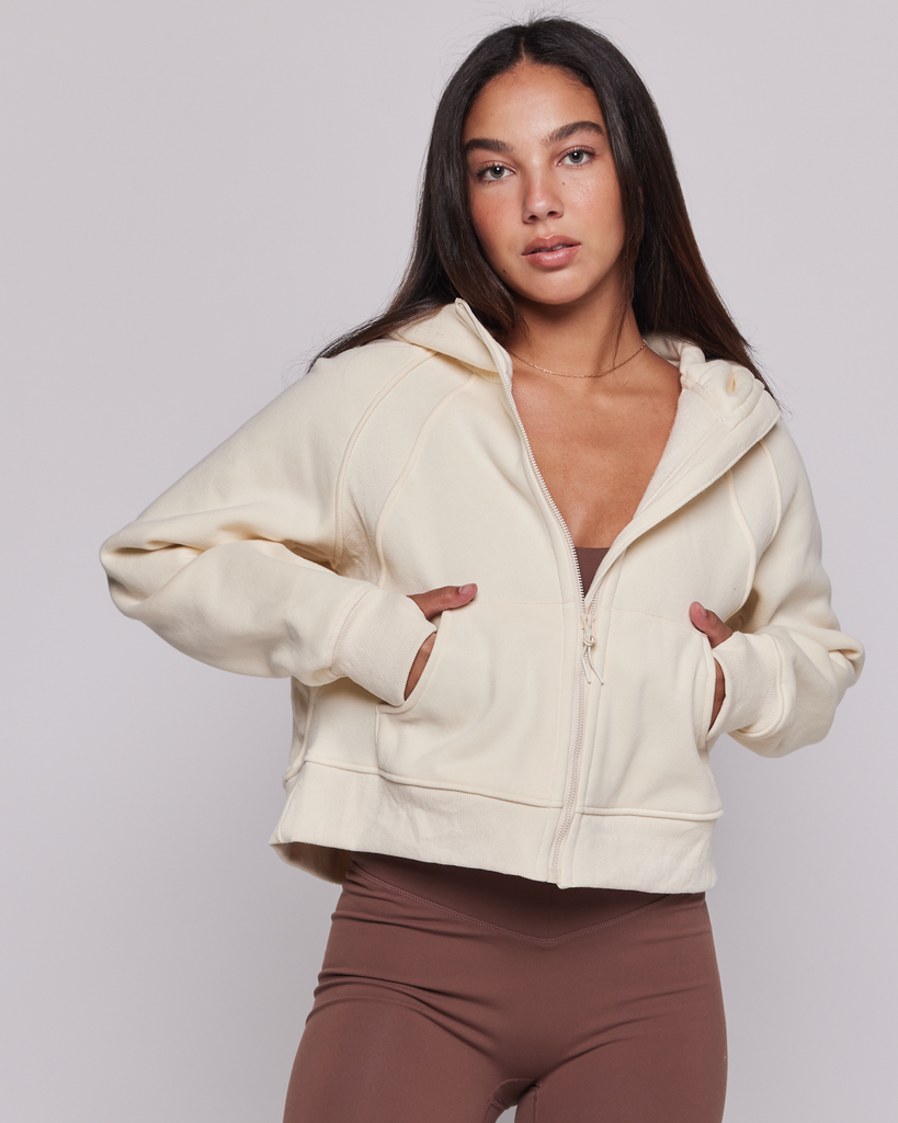 Unwind in style with our boxy full zip hoodie silhouette. Features a semi crop length that lands just below the waist, a funnel neck, thumbholes, and made in fleece scuba fabric – it's irresistibly soft and a loungewear game changer.