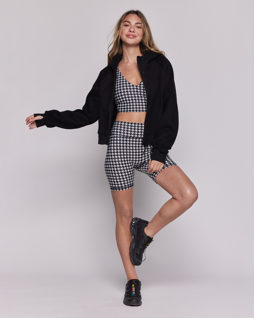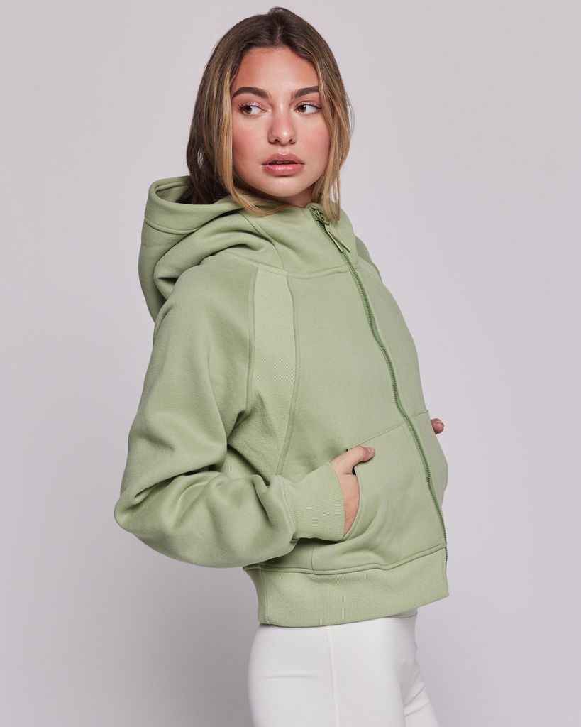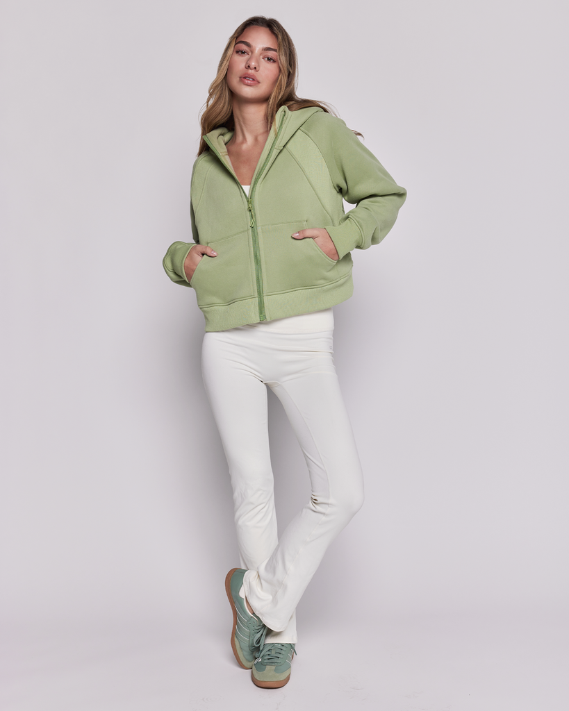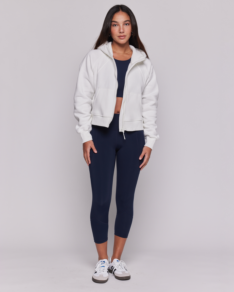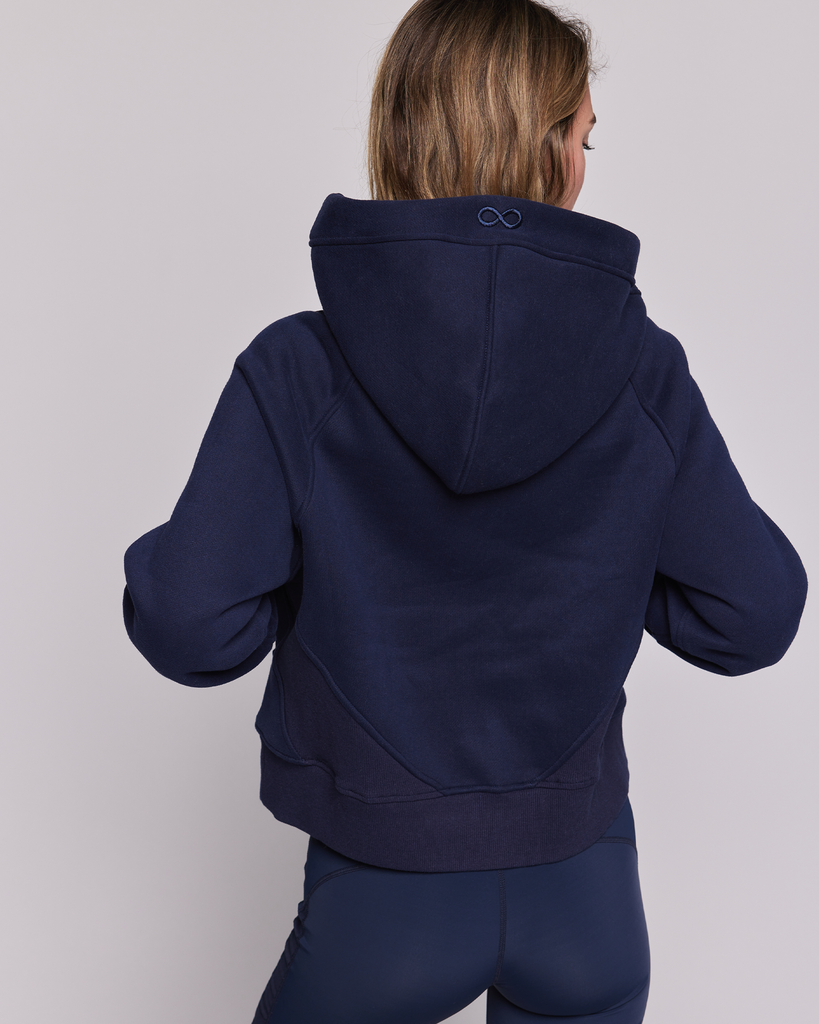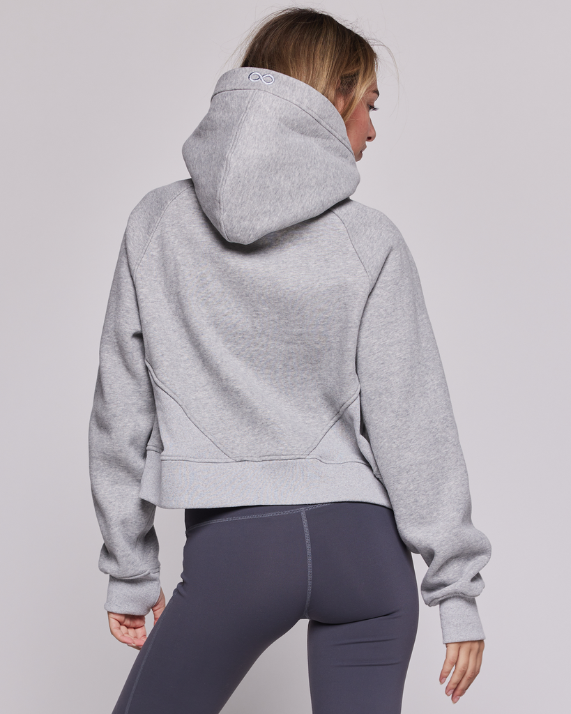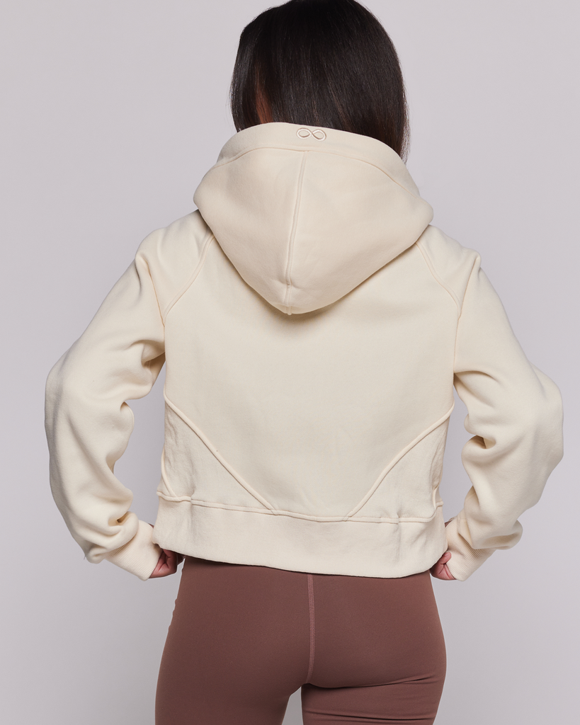 Unwind in style with our boxy full zip hoodie silhouette. Features a semi crop length that lands just below the waist, a funnel neck, thumbholes, and made in fleece scuba fabric – it's irresistibly soft and a loungewear game changer.