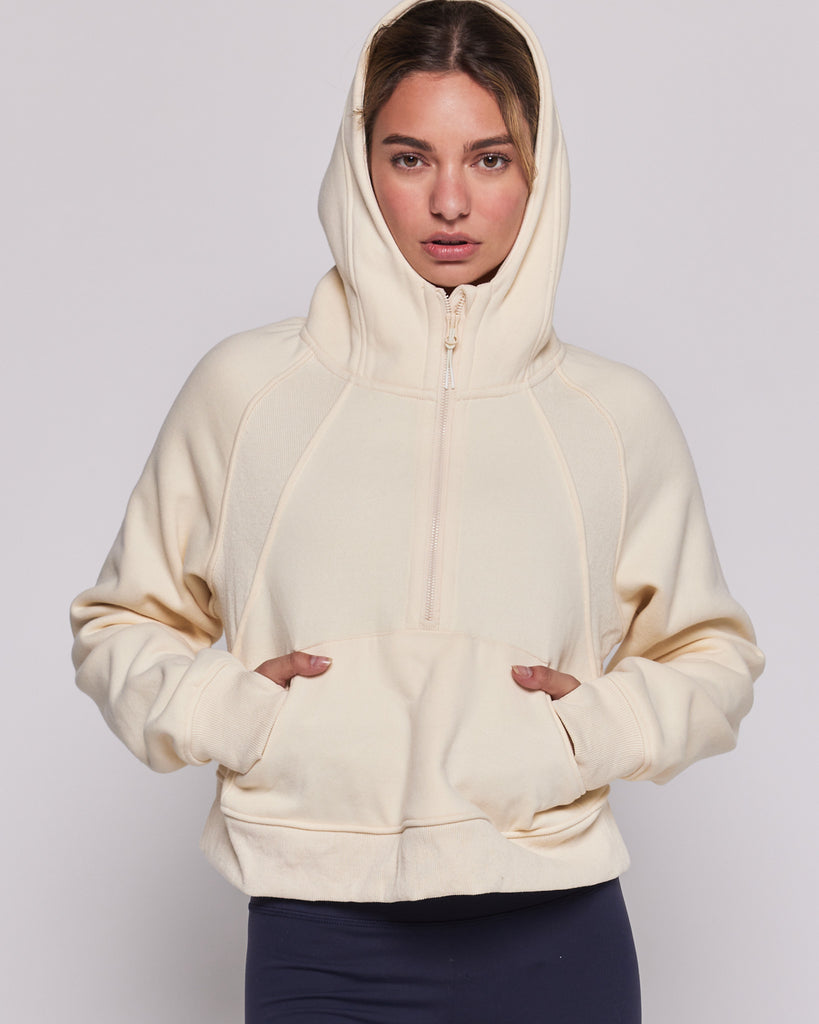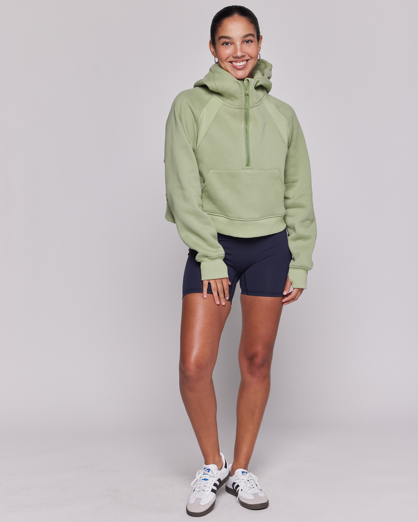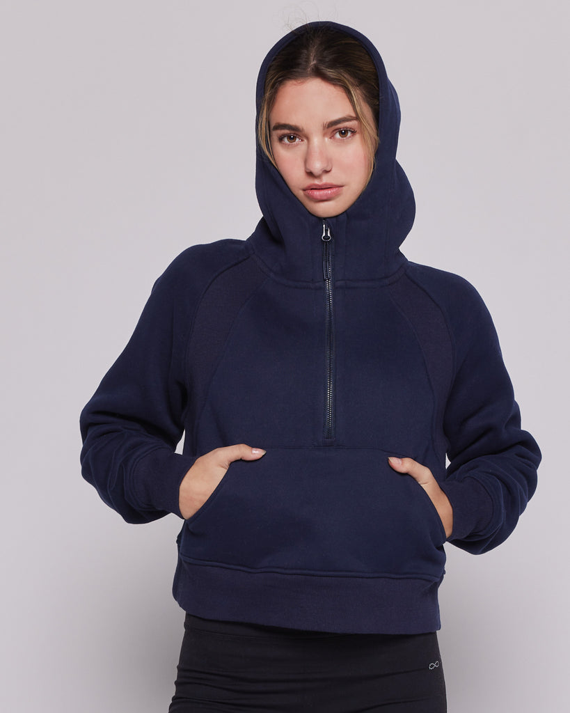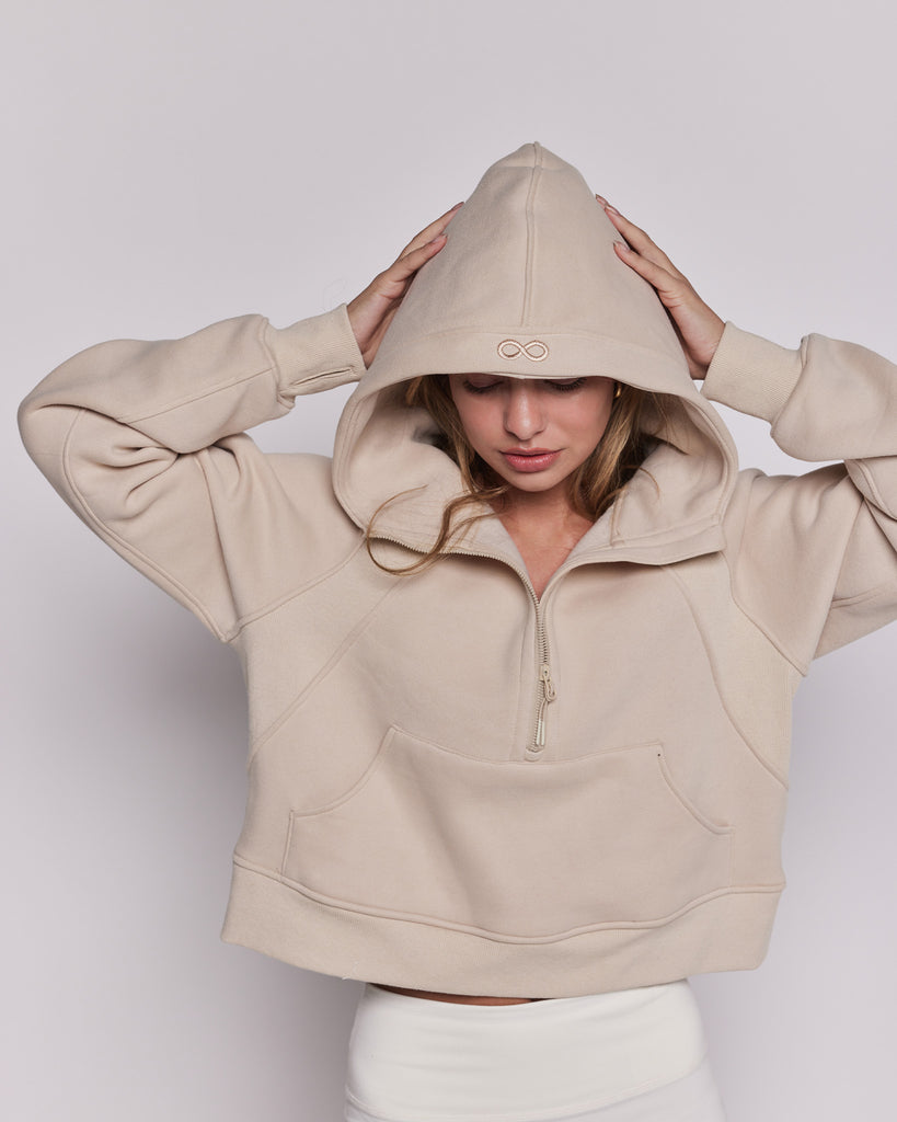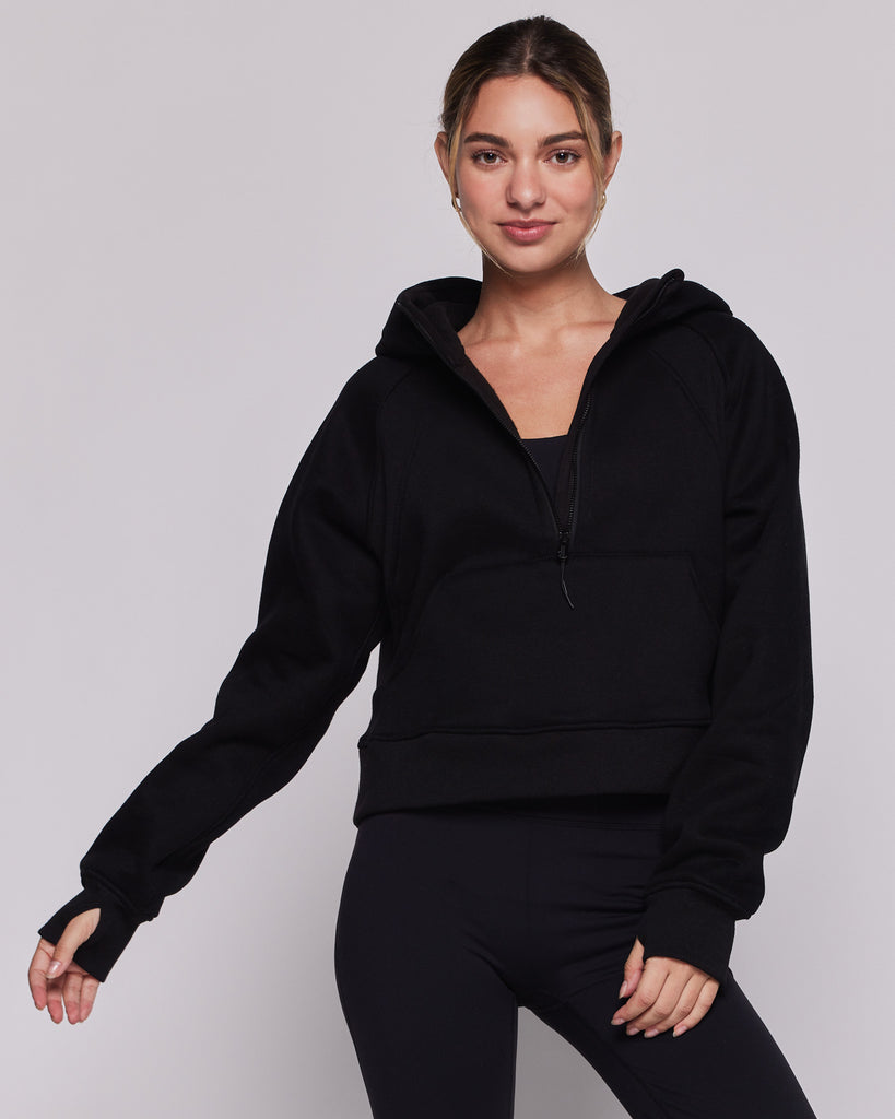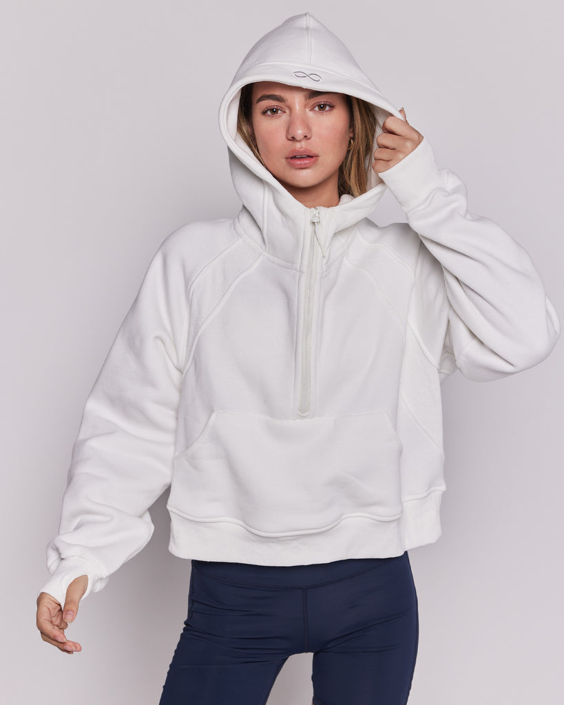 Unwind in style with our boxy half zip hoodie silhouette. Features a semi crop length that lands just below the waist, a funnel neck, thumbholes, and made in fleece scuba fabric – it's irresistibly soft and a loungewear game changer.