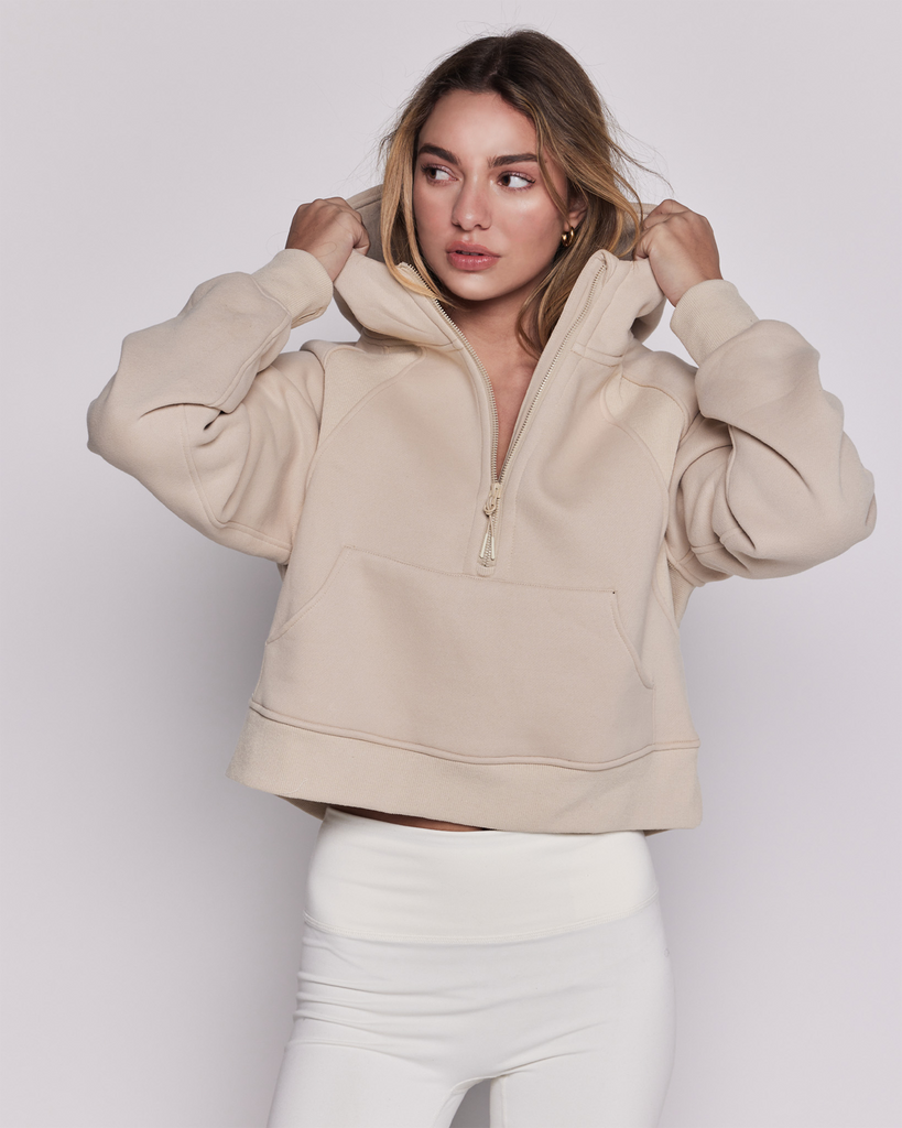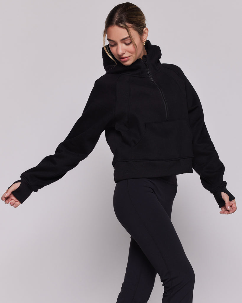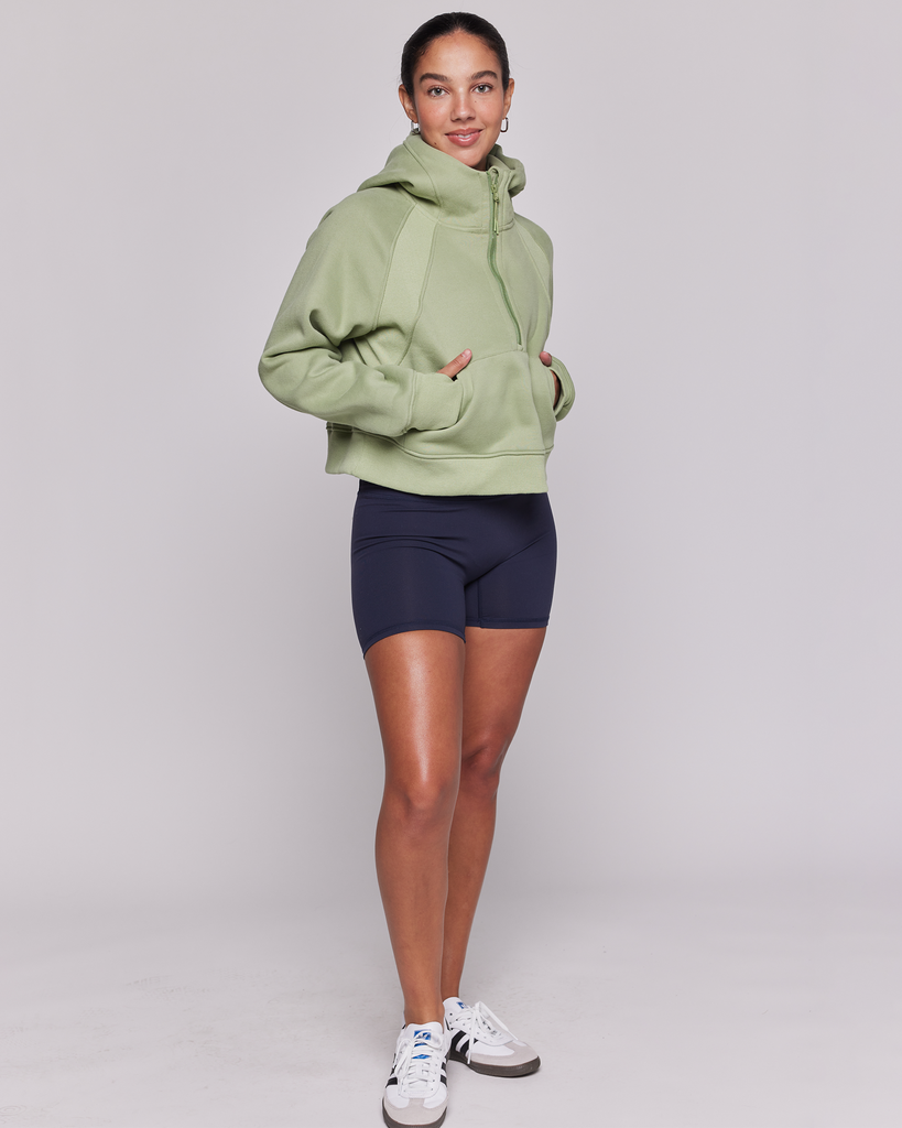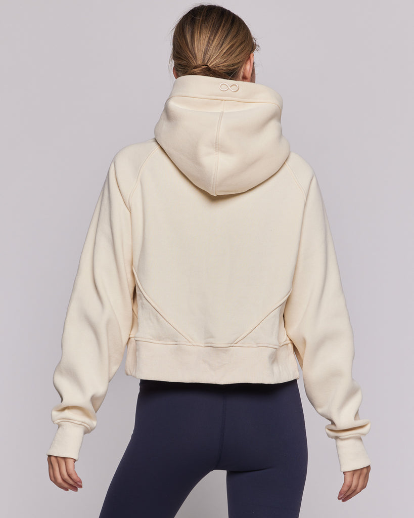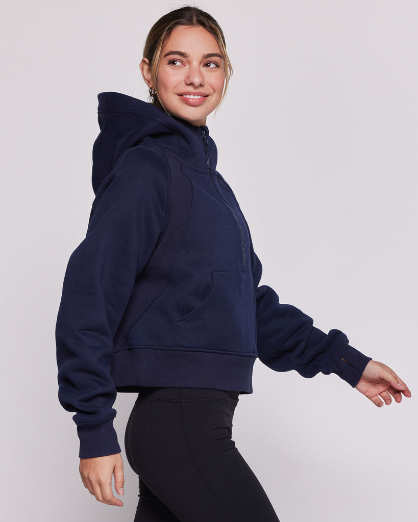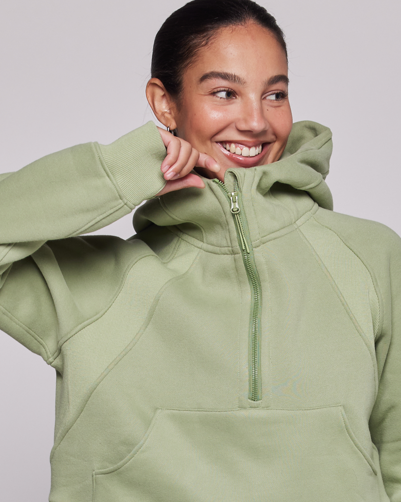Unwind in style with our boxy half zip hoodie silhouette. Features a semi crop length that lands just below the waist, a funnel neck, thumbholes, and made in fleece scuba fabric – it's irresistibly soft and a loungewear game changer.