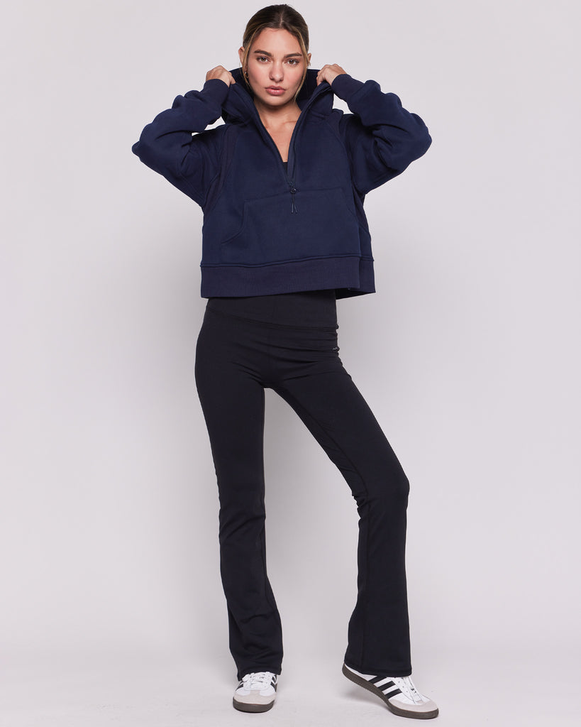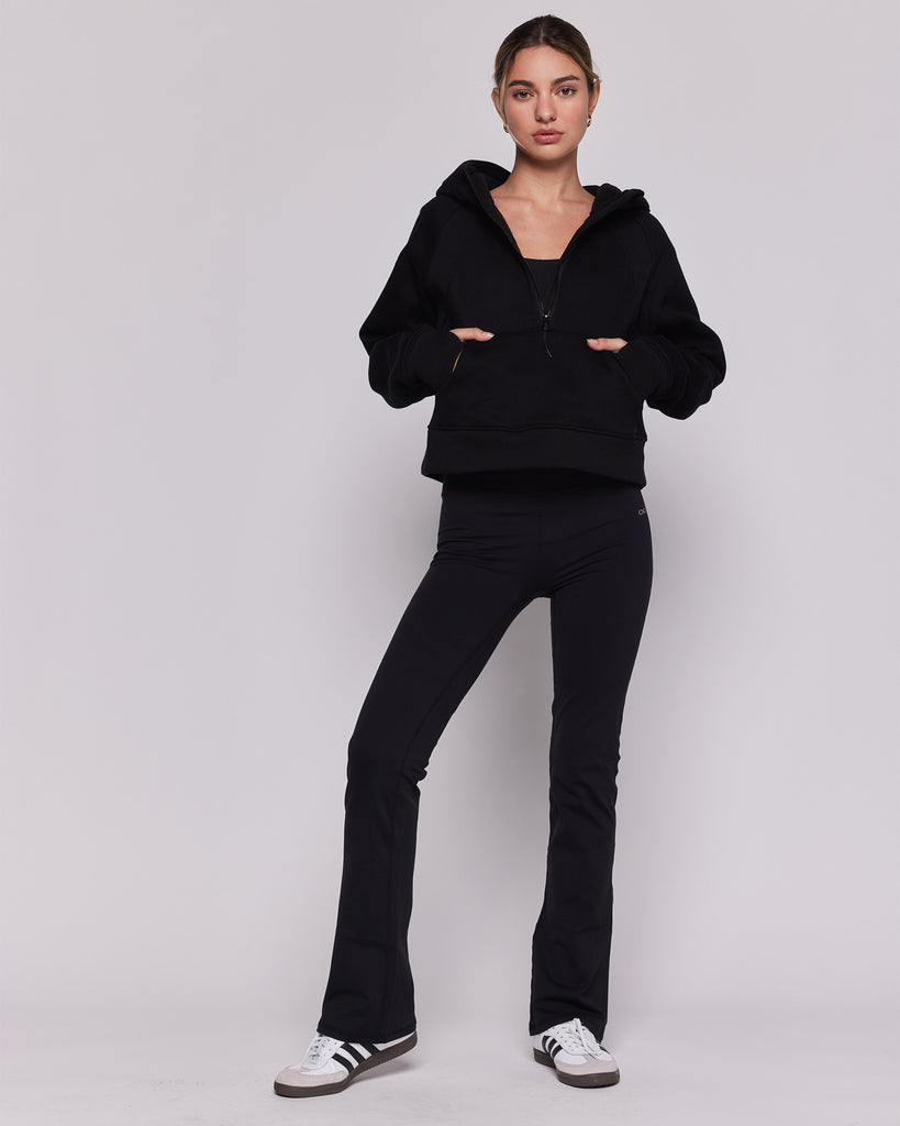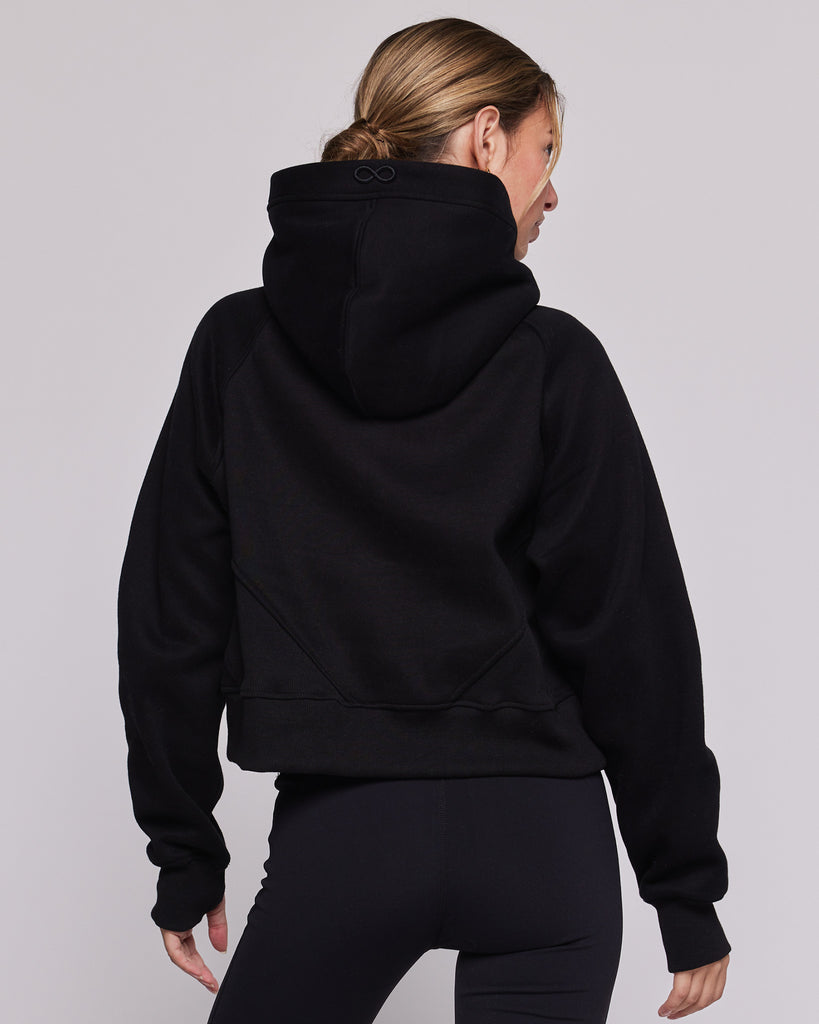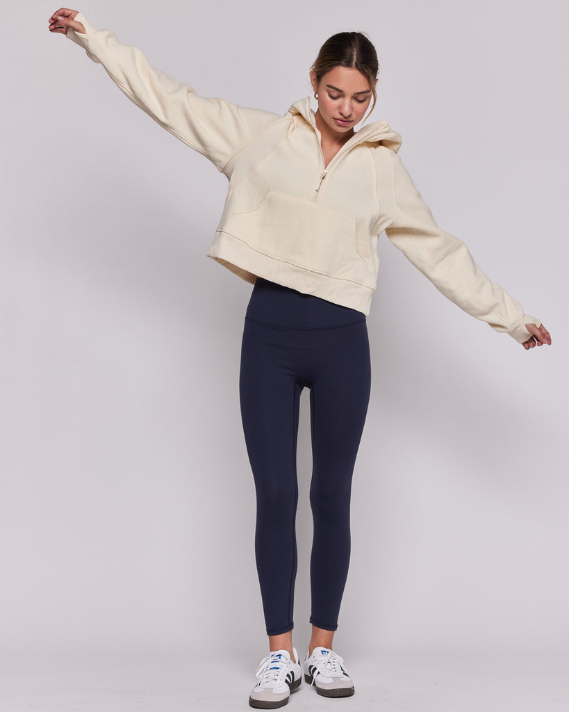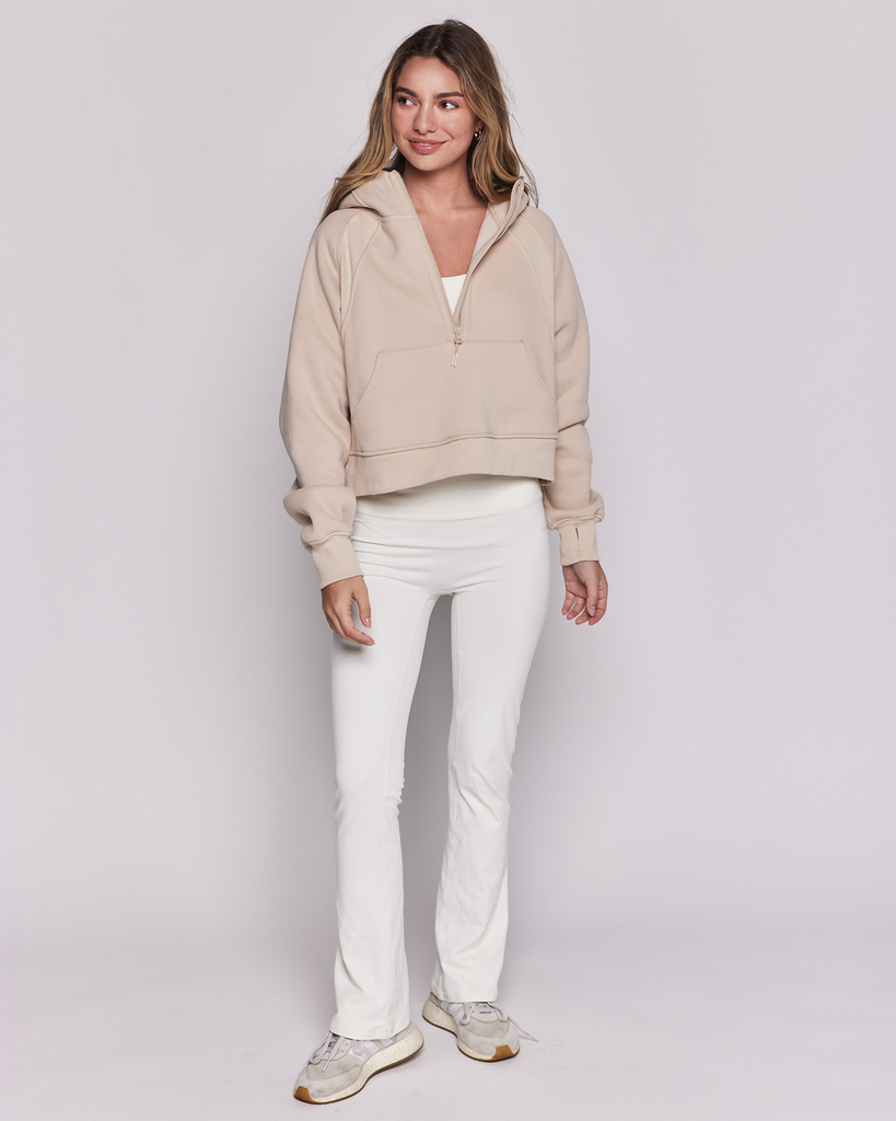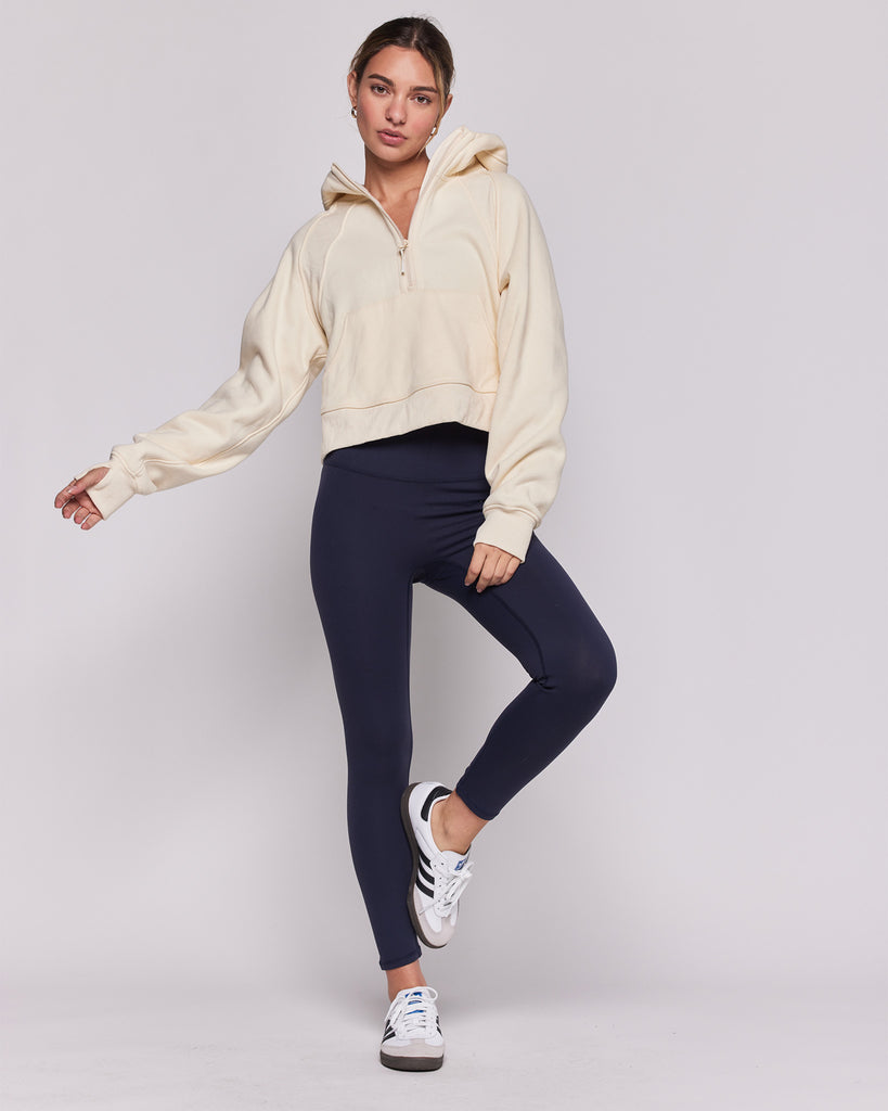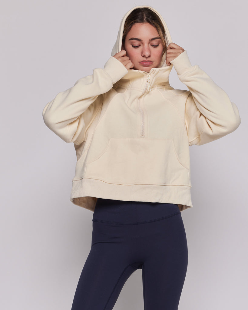 Unwind in style with our boxy half zip hoodie silhouette. Features a semi crop length that lands just below the waist, a funnel neck, thumbholes, and made in fleece scuba fabric – it's irresistibly soft and a loungewear game changer.