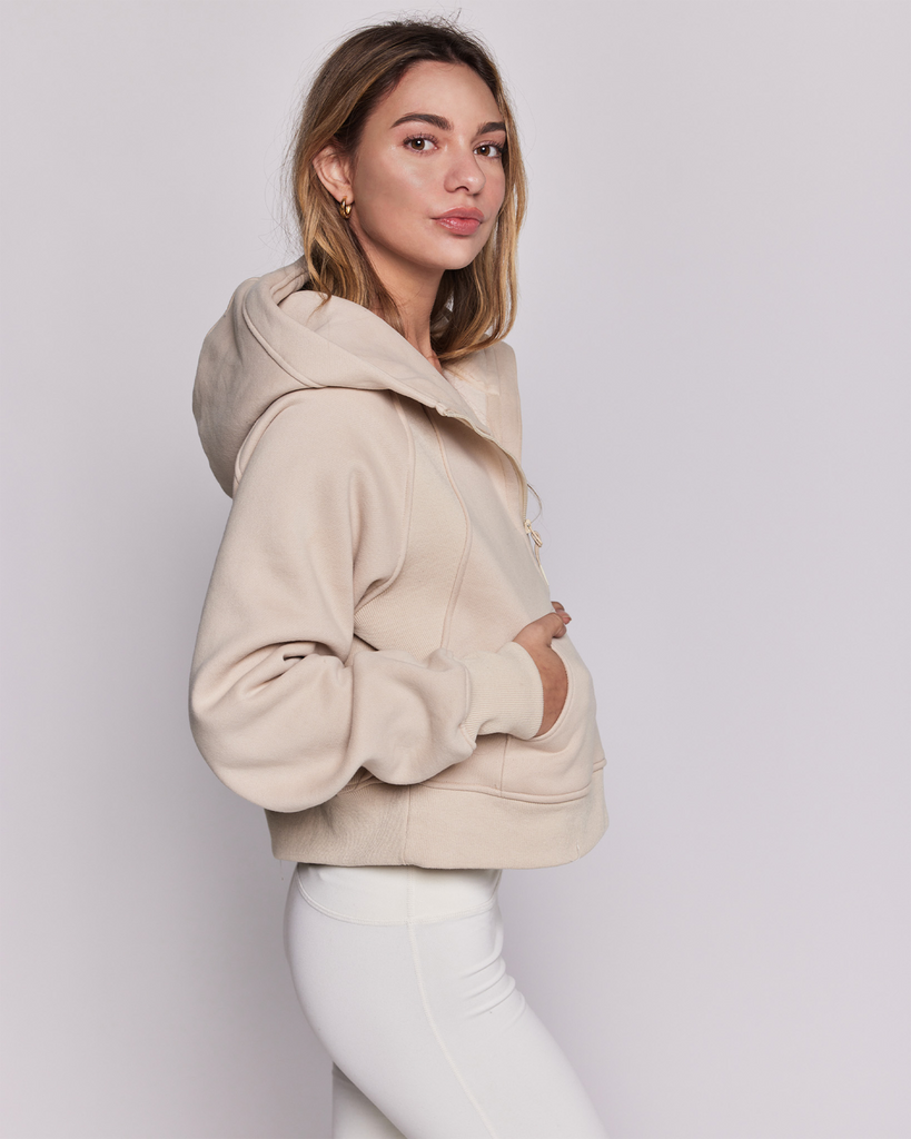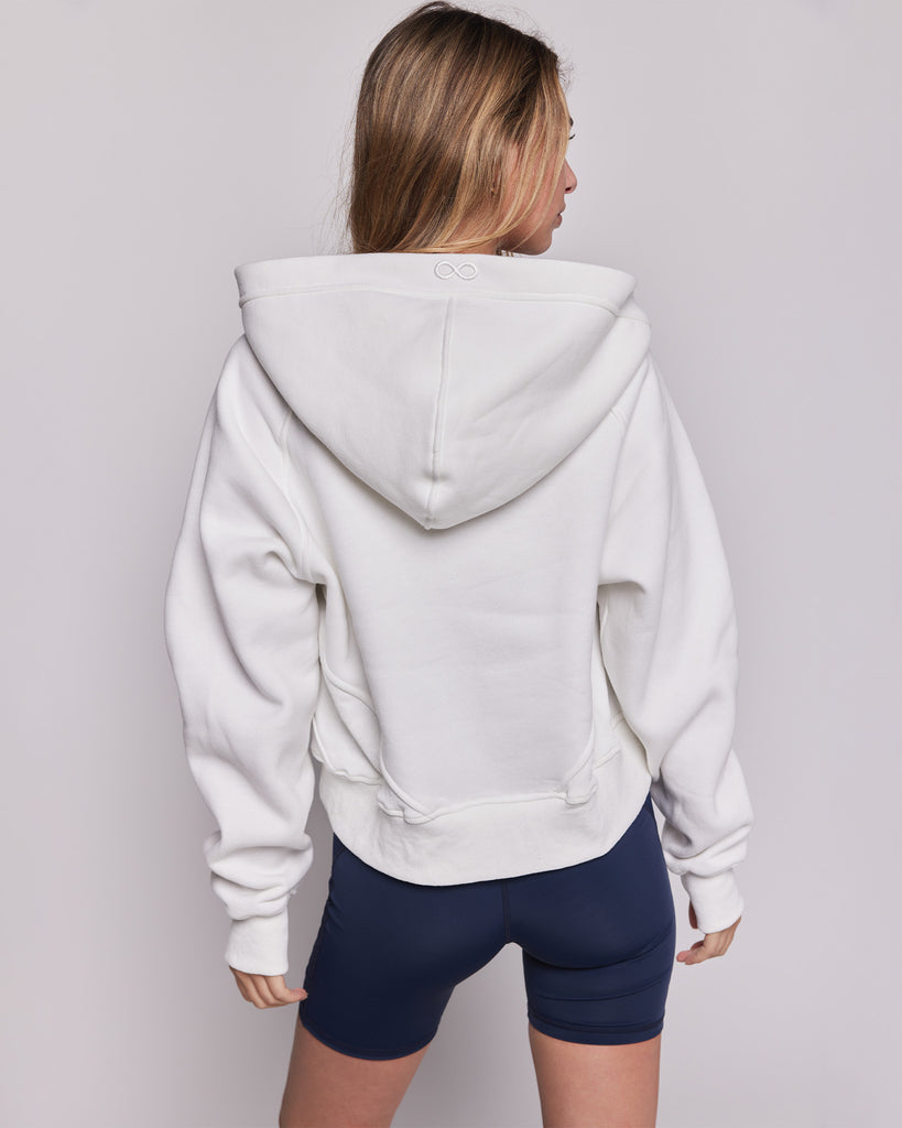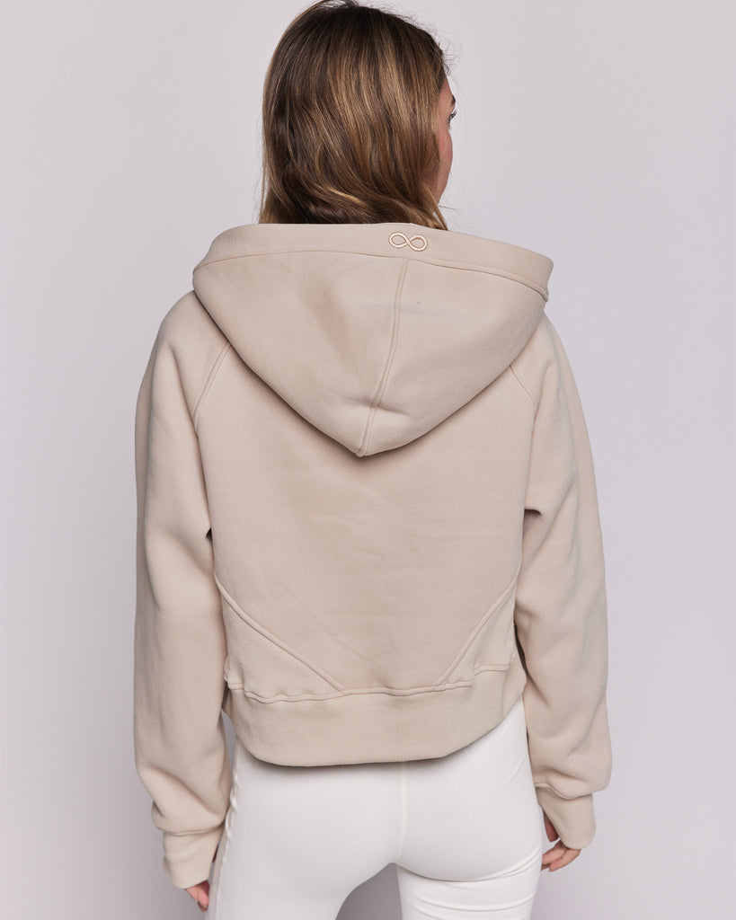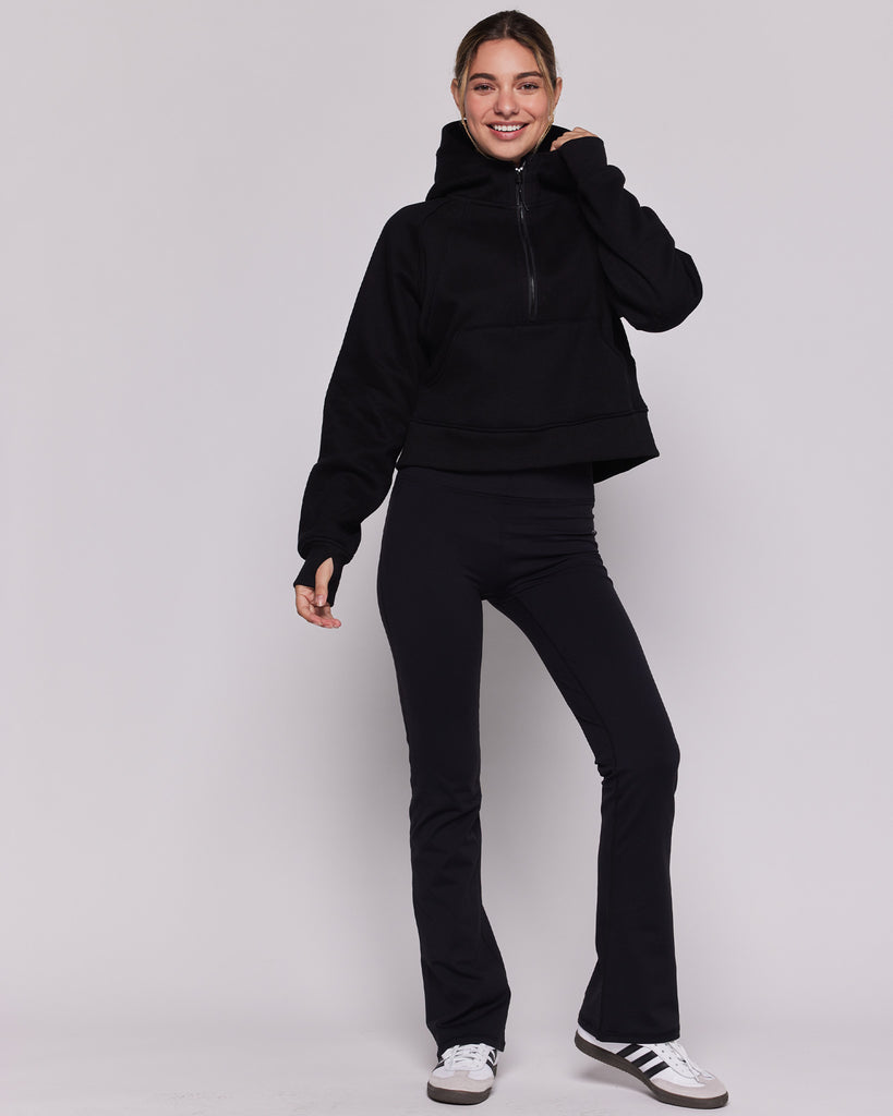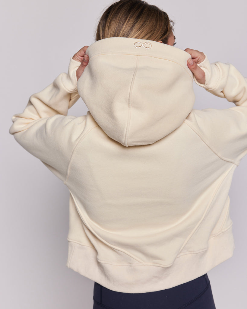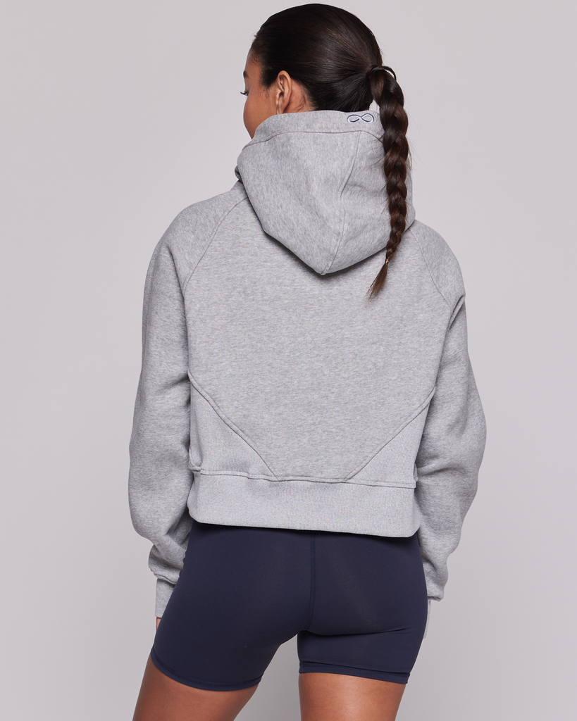 Unwind in style with our boxy half zip hoodie silhouette. Features a semi crop length that lands just below the waist, a funnel neck, thumbholes, and made in fleece scuba fabric – it's irresistibly soft and a loungewear game changer.