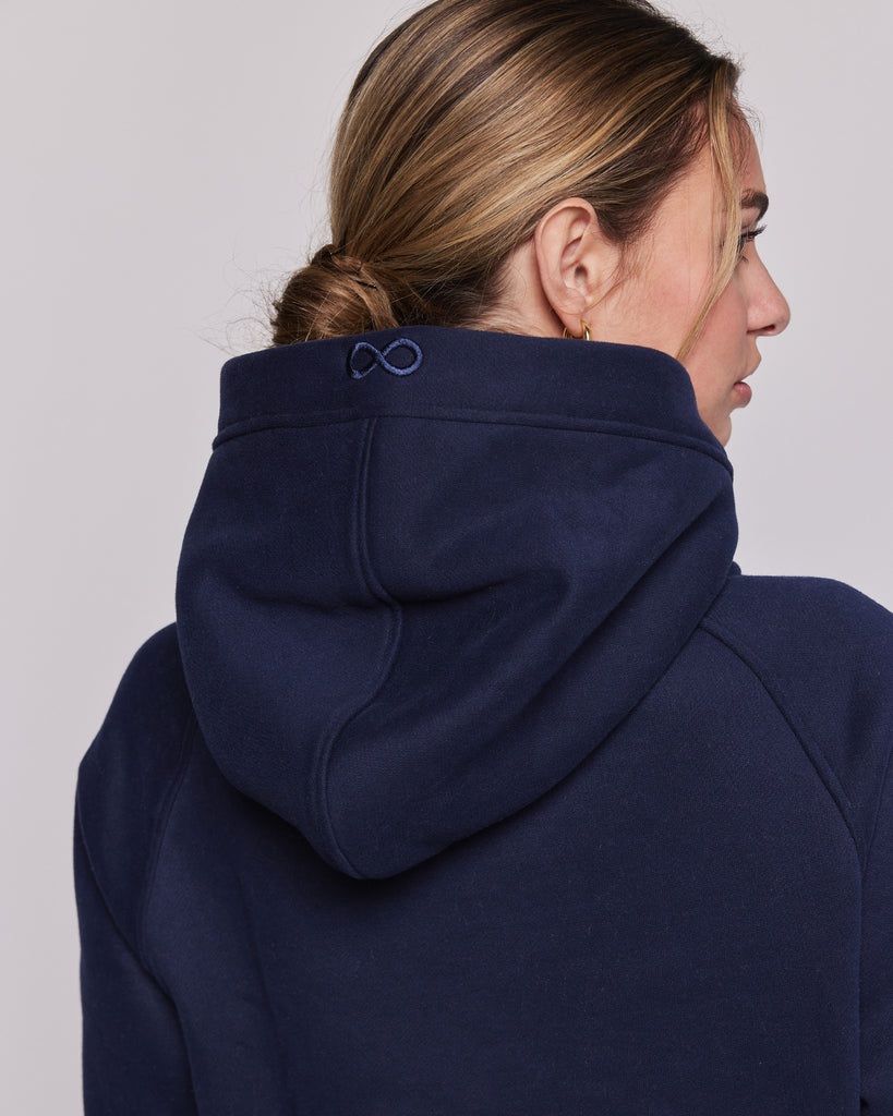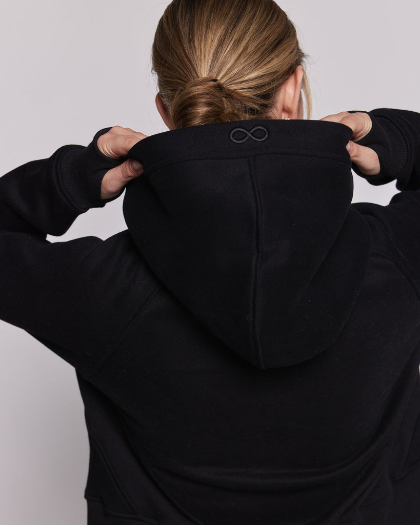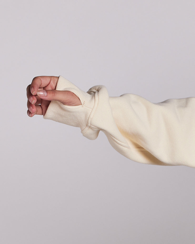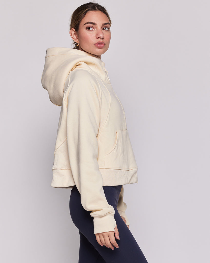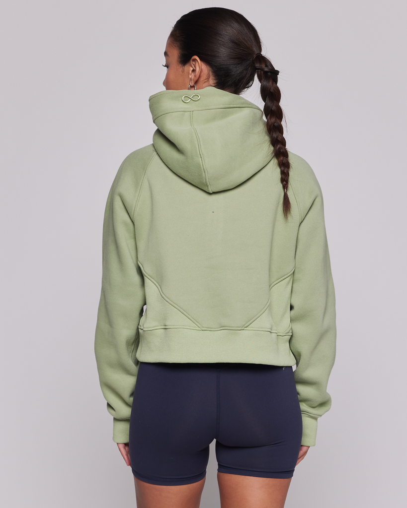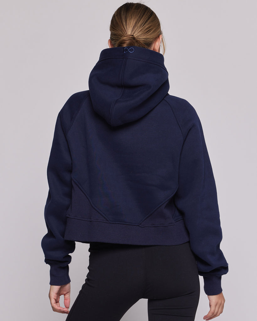 Unwind in style with our boxy half zip hoodie silhouette. Features a semi crop length that lands just below the waist, a funnel neck, thumbholes, and made in fleece scuba fabric – it's irresistibly soft and a loungewear game changer.