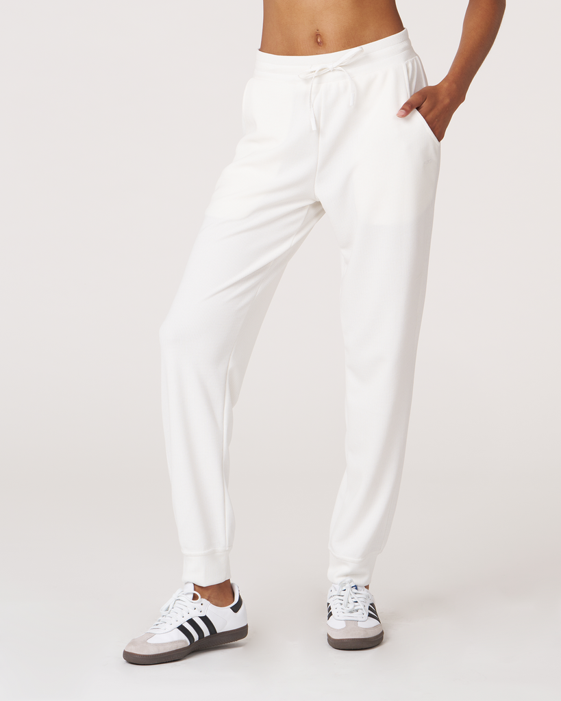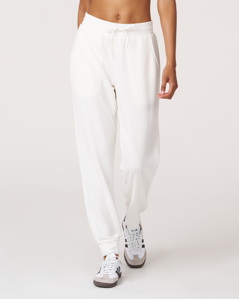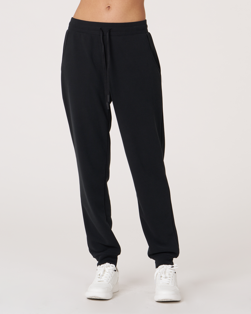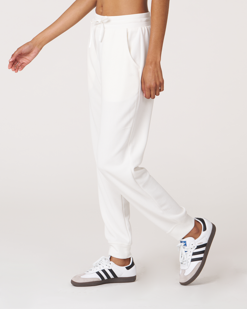 Features pockets and an encased elastic waist with drawstring to adjust the fit. Ideal to wear for travel, errands, or weekend lounging. The waffle-knit exterior has a cotton-like feel for comfort and sweat-wicking interior to keep you cool and dry. Lightweight and drapey, it's made from a luxurious blend of 49% Modal, 45% polyester, 6% Spandex.