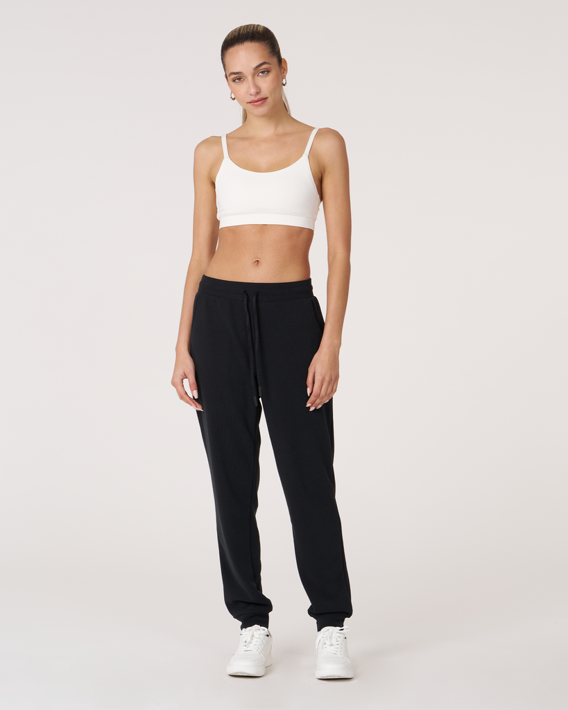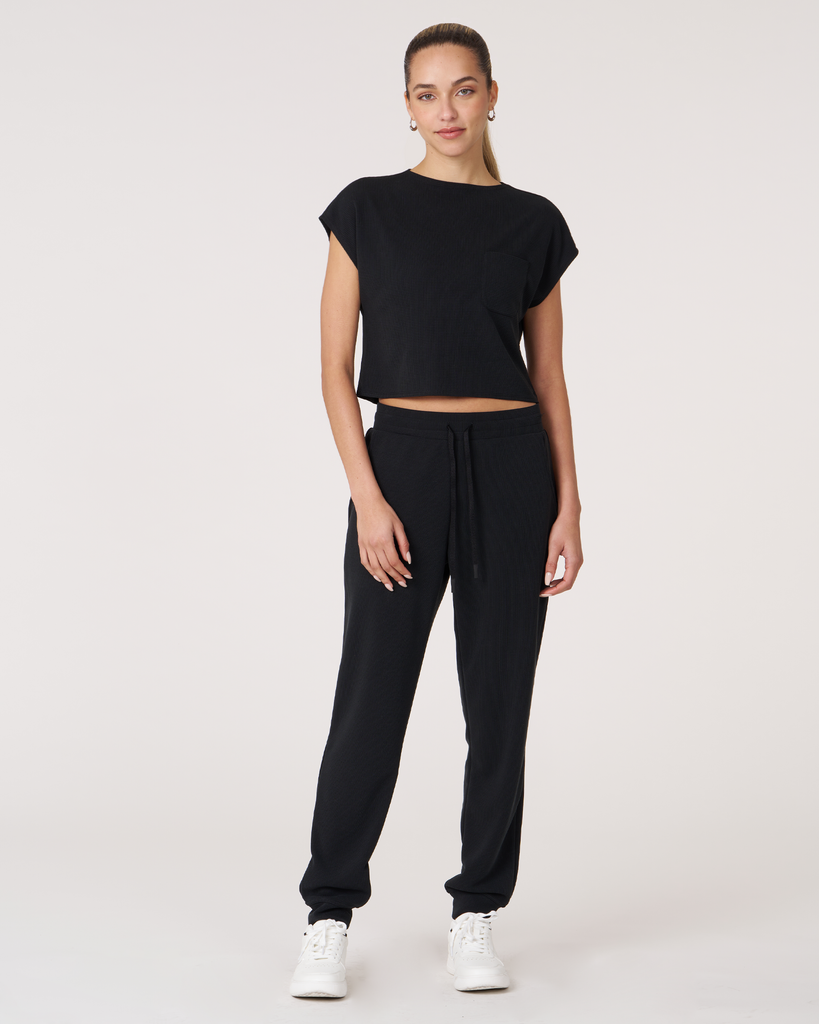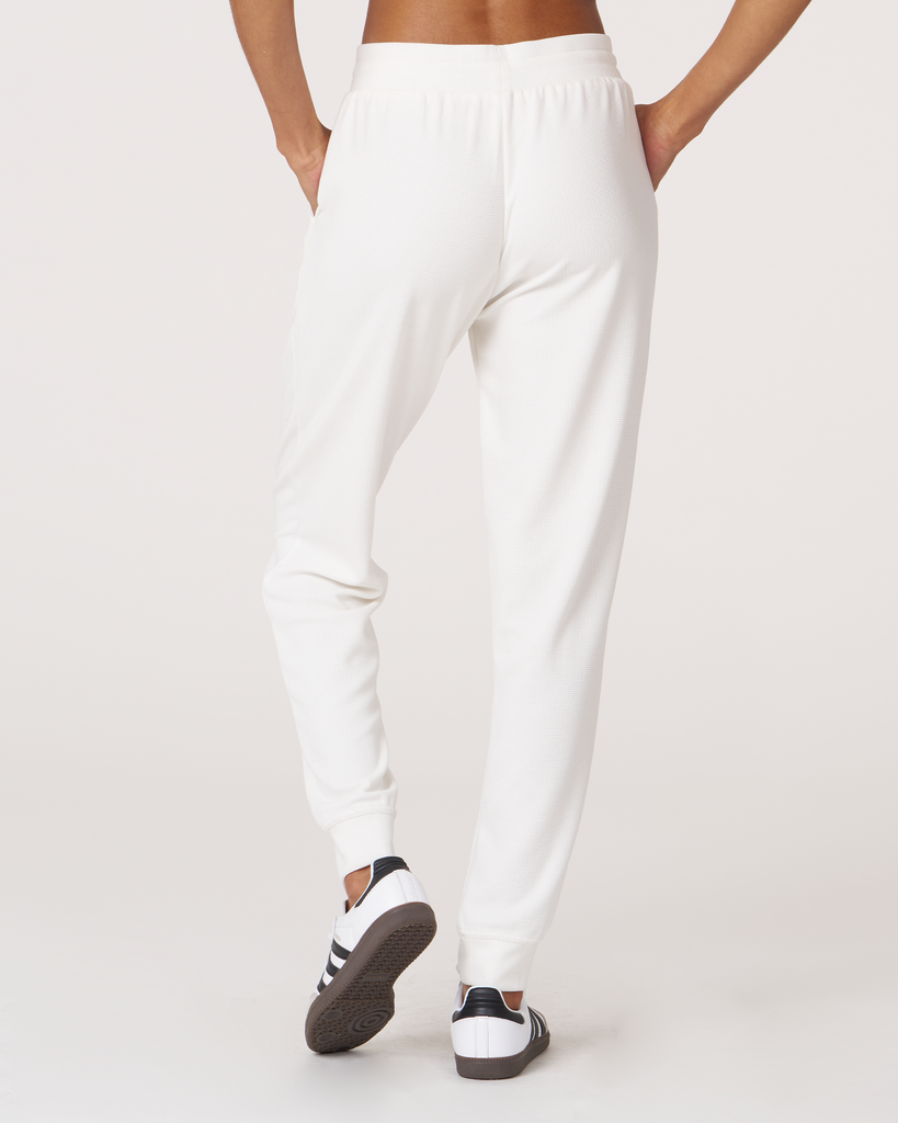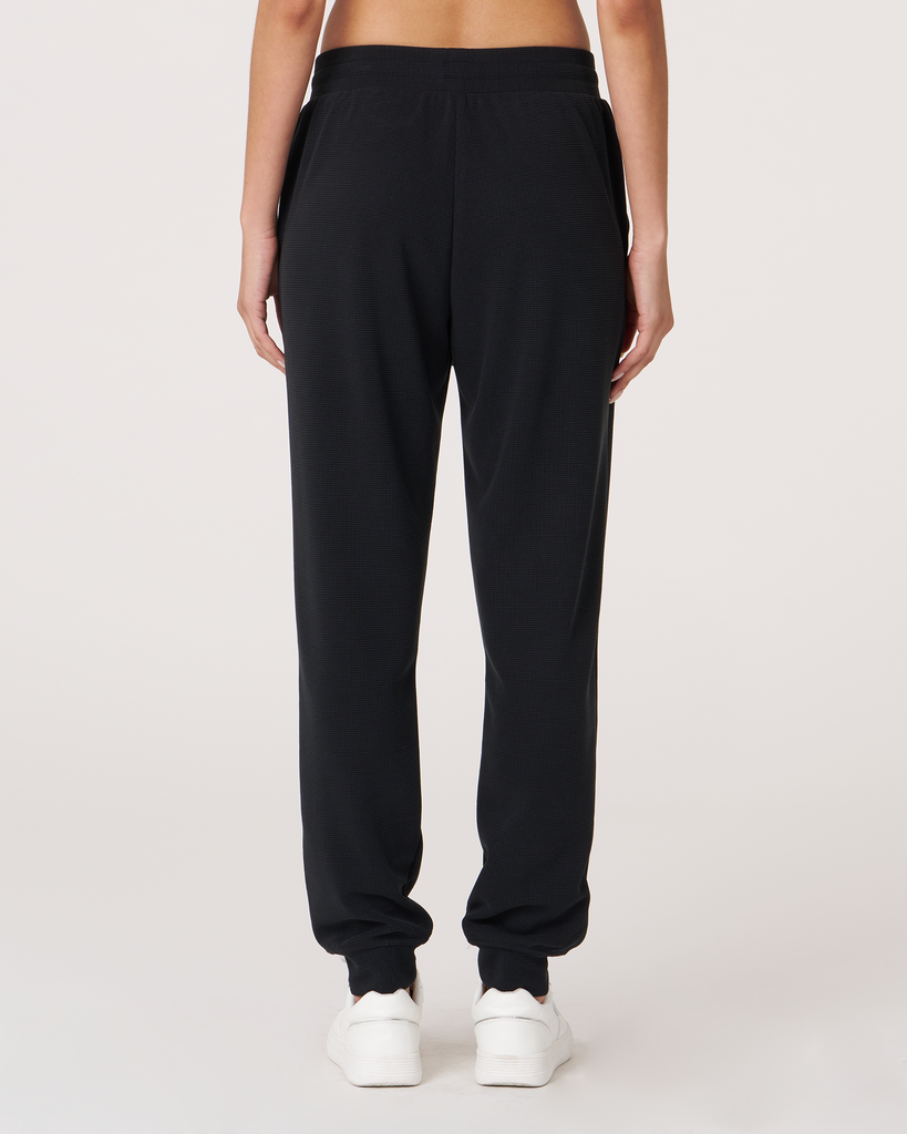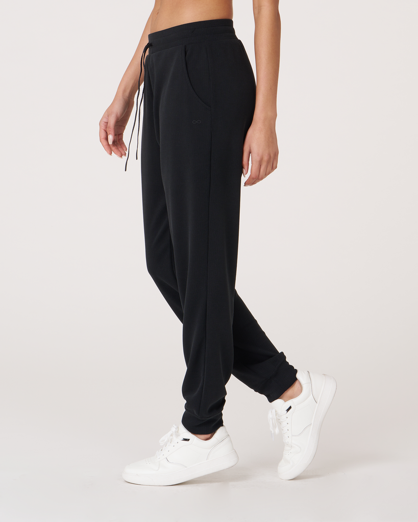 Features pockets and an encased elastic waist with drawstring to adjust the fit. Ideal to wear for travel, errands, or weekend lounging. The waffle-knit exterior has a cotton-like feel for comfort and sweat-wicking interior to keep you cool and dry. Lightweight and drapey, it's made from a luxurious blend of 49% Modal, 45% polyester, 6% Spandex.