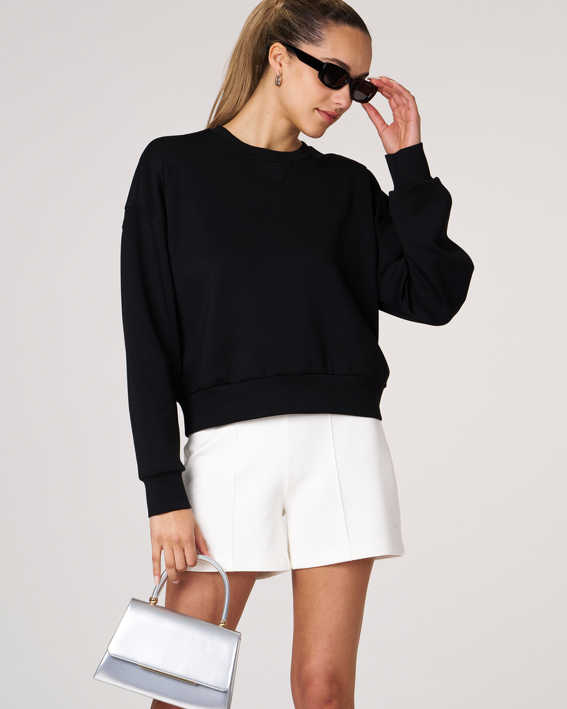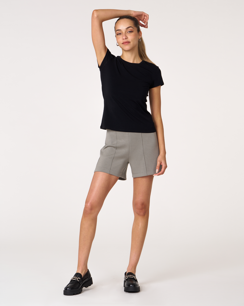 Step into elegance with our Pintuck Shorts, designed to take you from the office to an evening out with ease. These shorts are both modern and flattering. The subtle embroidered logo adds a sophisticated touch, making these pants a versatile wardrobe essential. Pair them with a tucked in top for a casual professional look during the day and layer with an oversized blazer for a night out. Made from our luxurious scuba fabric, it is has a medium-weight coverage and a drapey feel that is cooling and smooth to touch.