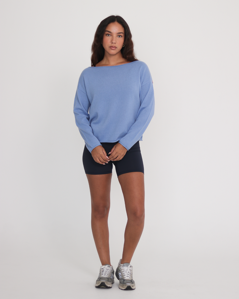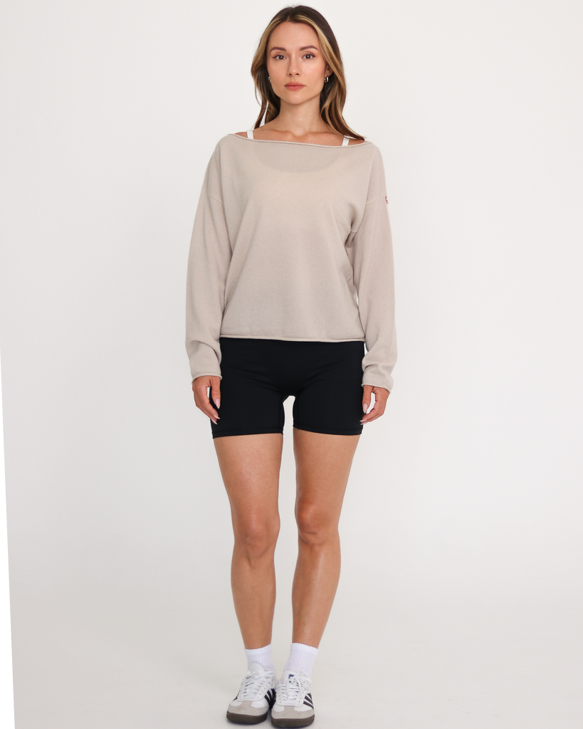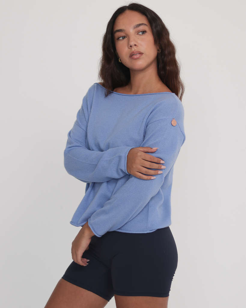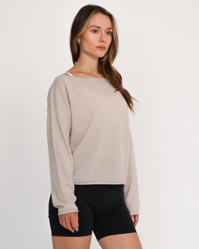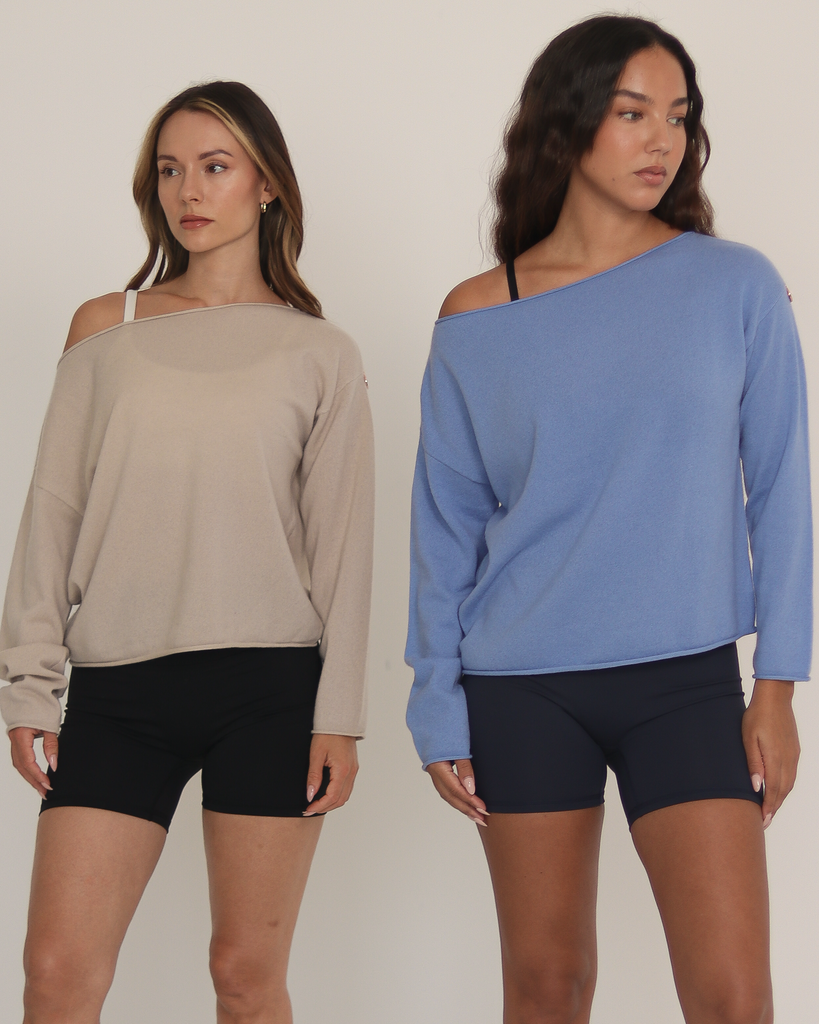Comfort you can wear two ways. Knit in soft cashmere, this top features a wide neckline that works as a classic boat neck or can be shifted off the shoulder for a more relaxed edge. A medium lightweight yet plush and luxuriously warm, it layers effortlessly over activewear or dressed up easily for everyday wear, bringing luxury in your daily life.